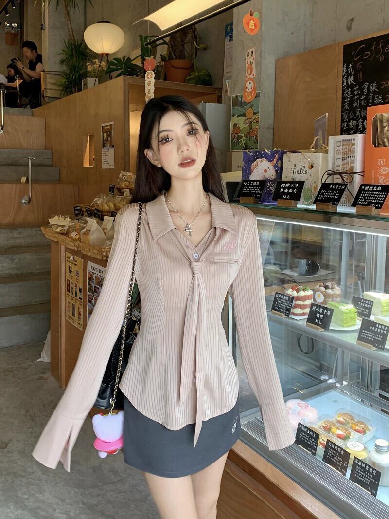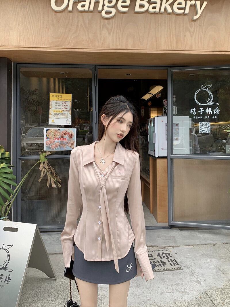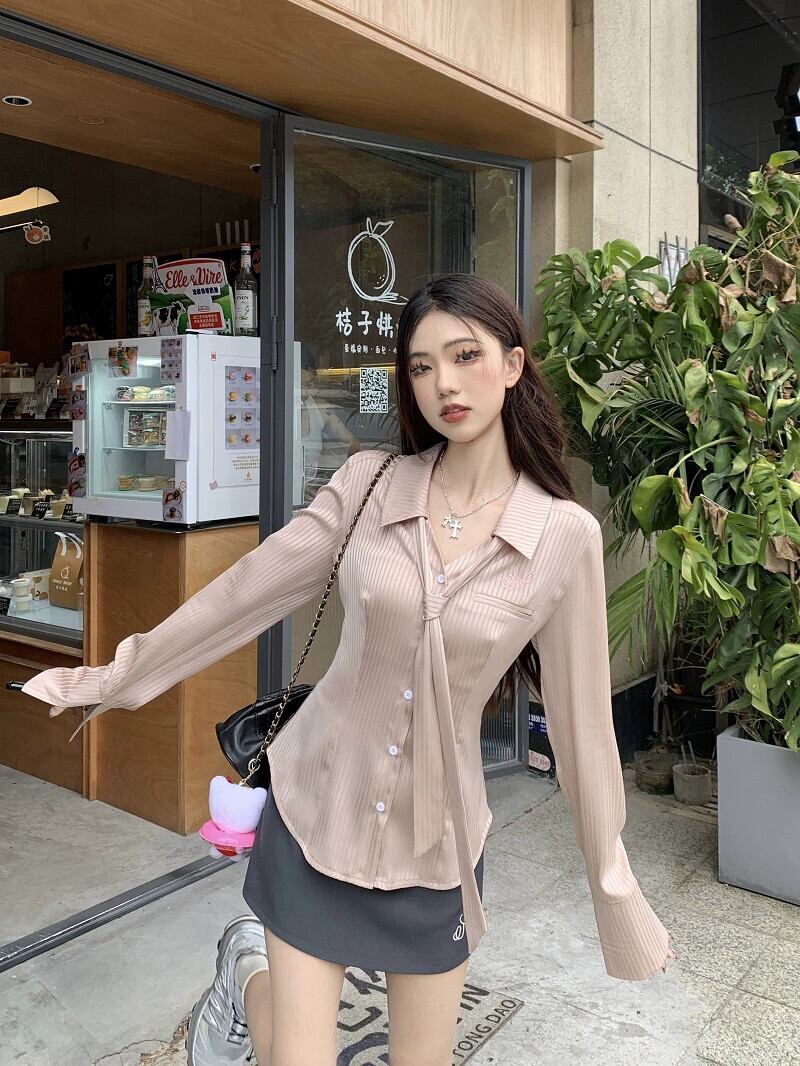 純粋な欲望ストライプサテン長袖シャツ女性秋 2023 新しいスタイルウエスト痩身デザインネクタイ気質トップ ロング オータム 秋物 missk32944333506