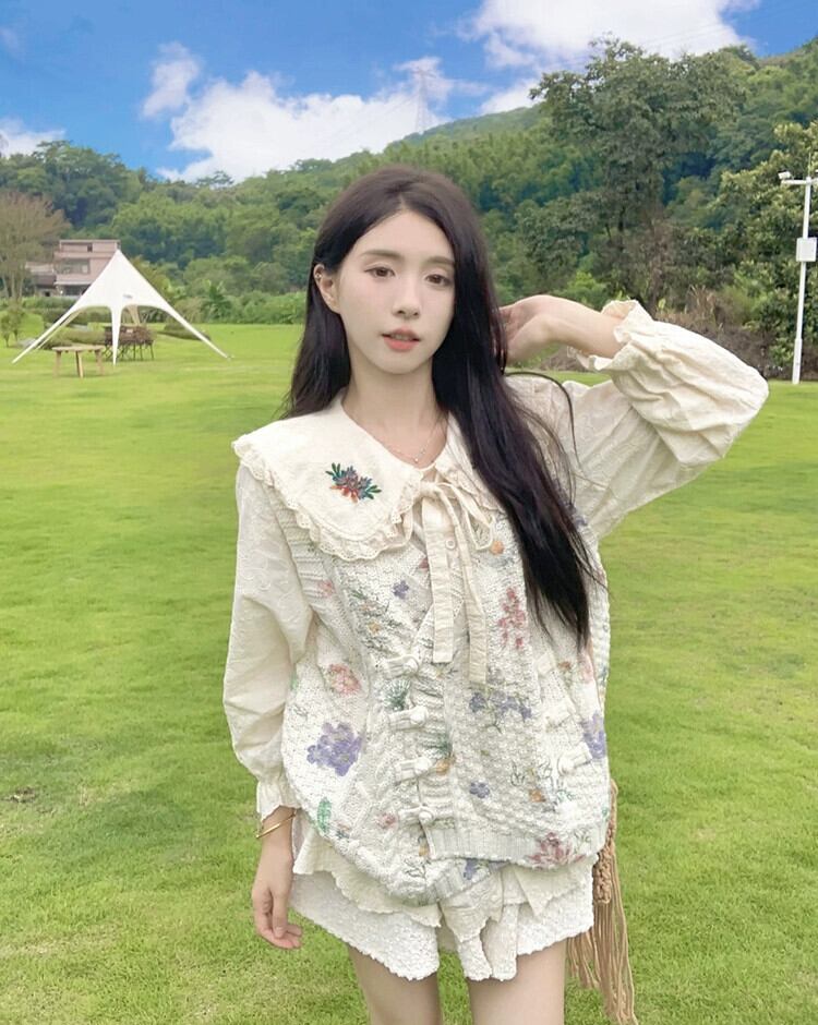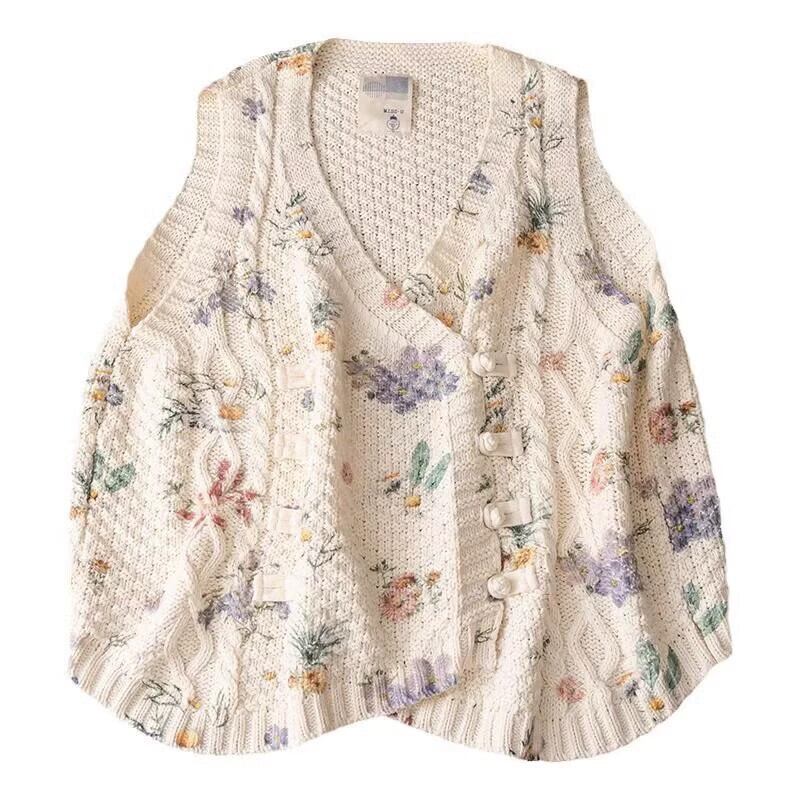 重工業国民風花柄ディスクボタンニットベスト人形襟長袖シャツ女性の秋のツーピースセット ロング オータム 秋物 missk63810631593