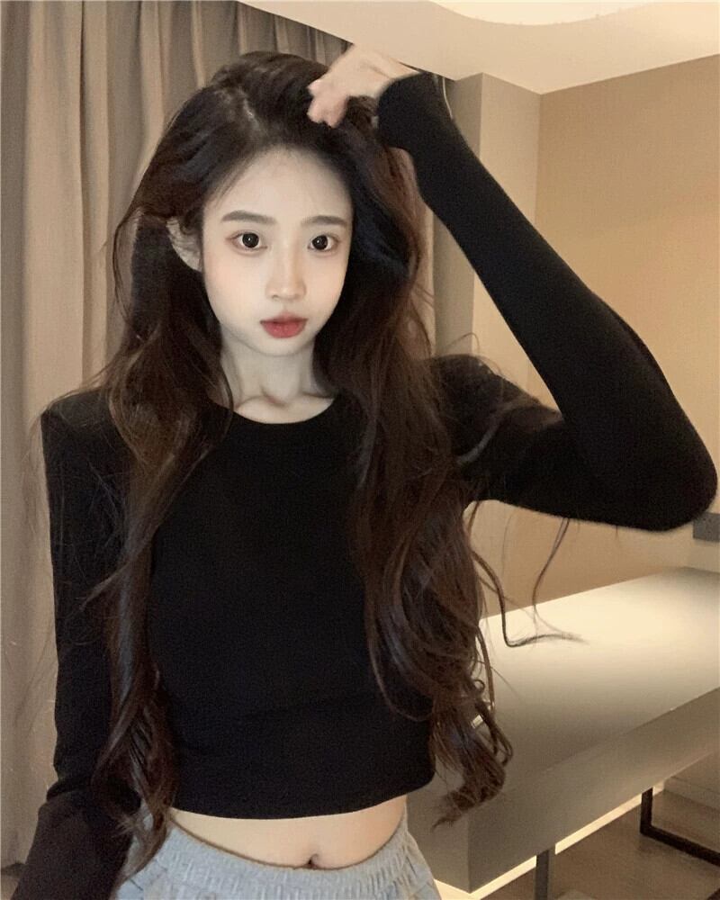 スキーム背中の開いた長袖底付け Tシャツ女性秋の新しいレトロスリムフィットファッショナブルなラウンドネックデザイントップ ロング オータム 秋物 Oネック missk79567262782