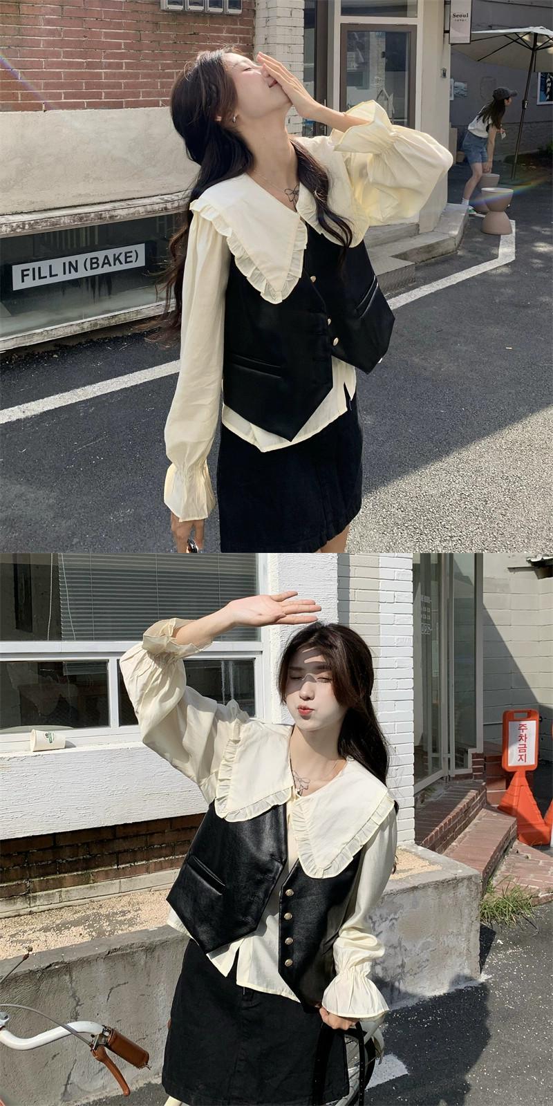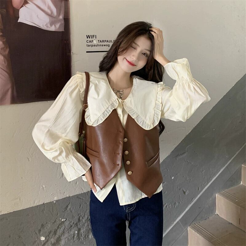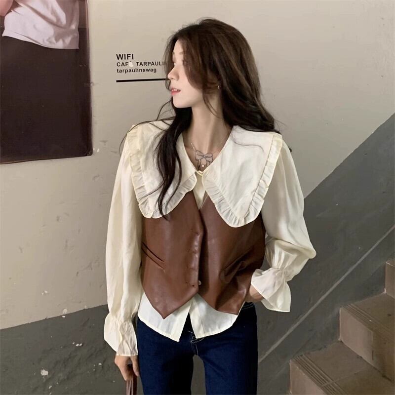 2023 秋の新スタイルのレトロなアウター PU レザーベスト + スリム人形の襟長袖シャツファッションスーツの女性 ロング オータム 秋物 missk76469090683