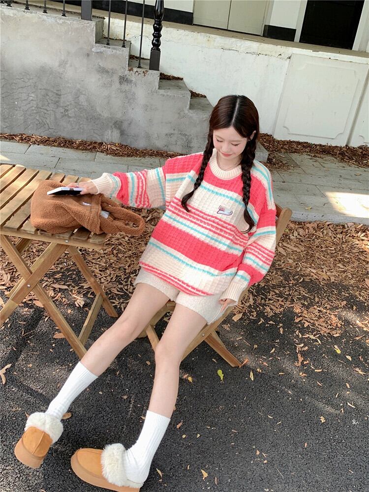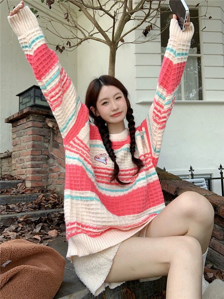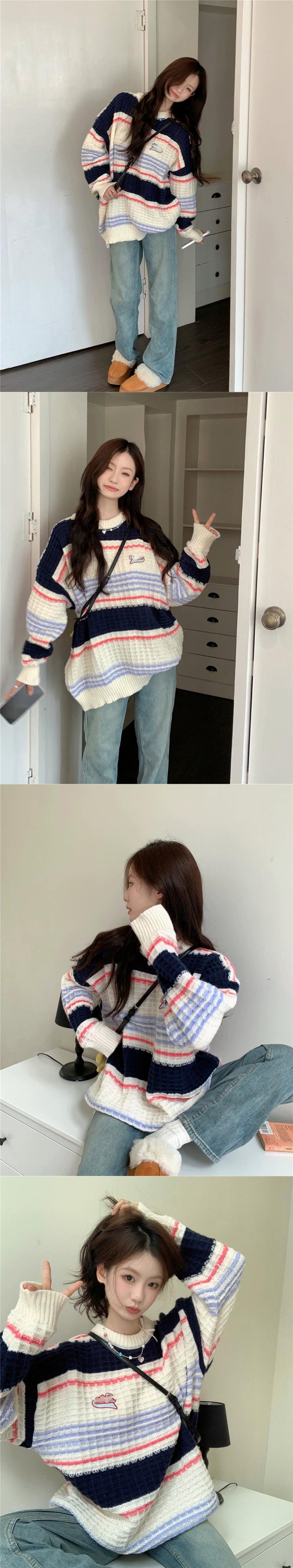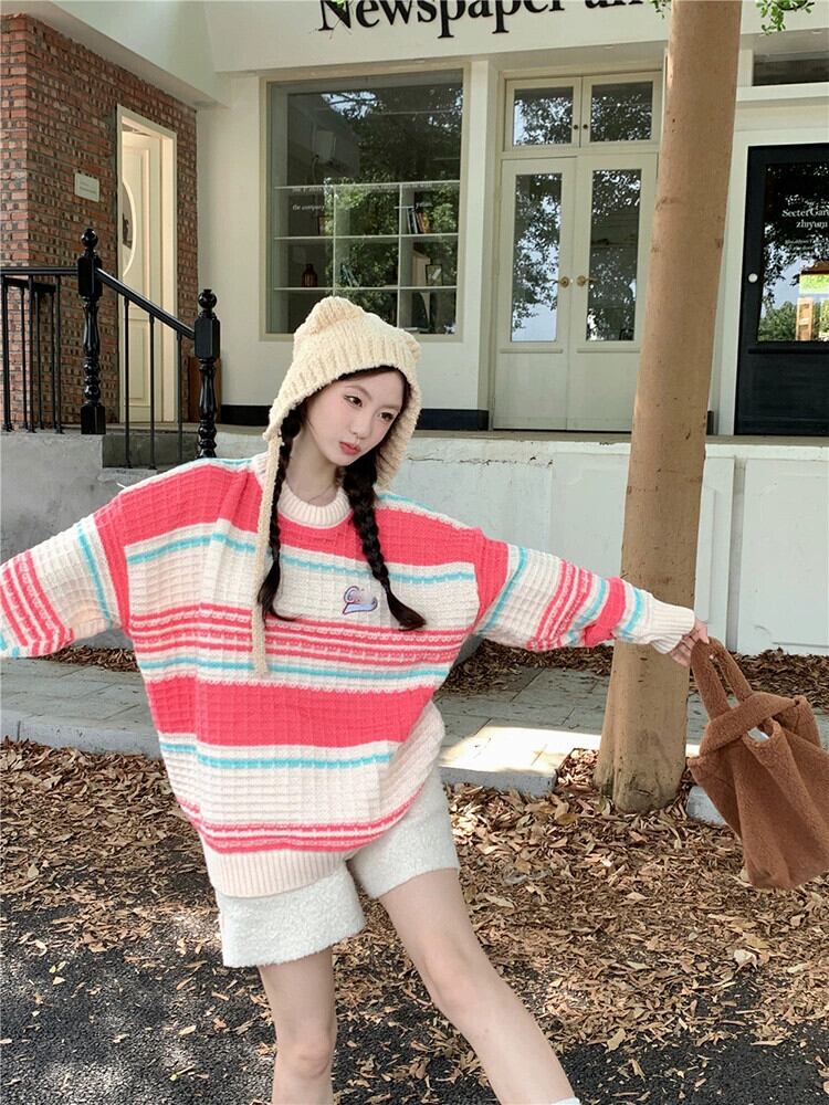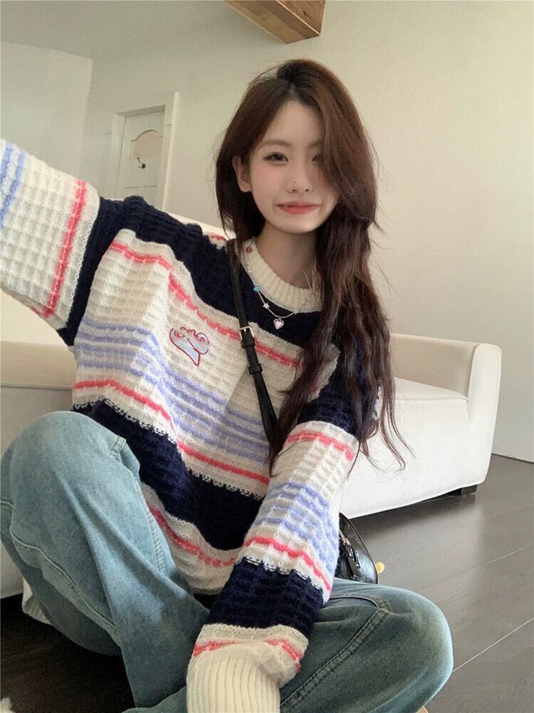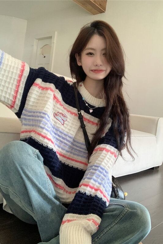 コントラストストライプ長袖セーター秋スタイル 2023 新ファッションルーズプルオーバーアウターニットトップ女性 ロング オータム 秋物 missk92617143827