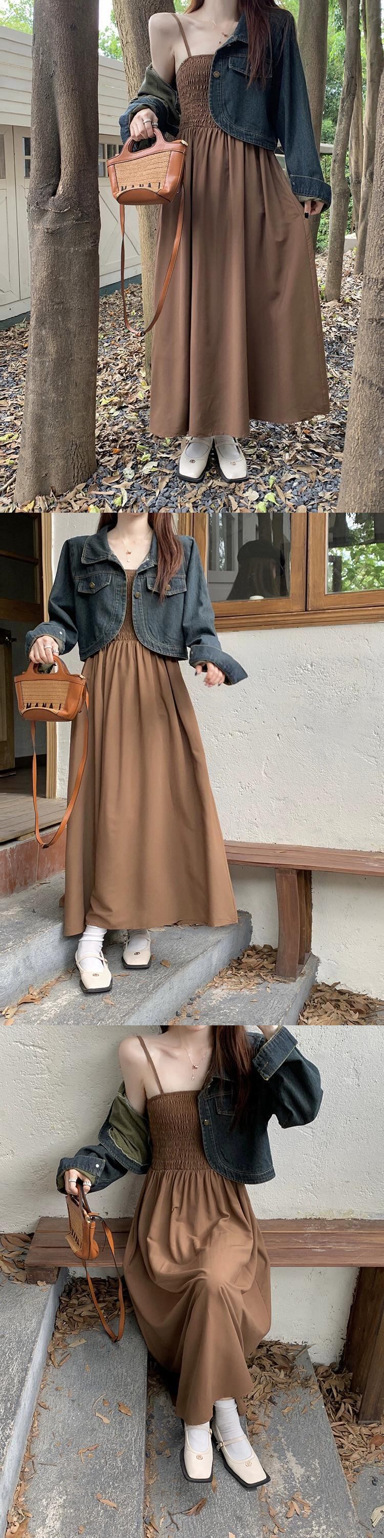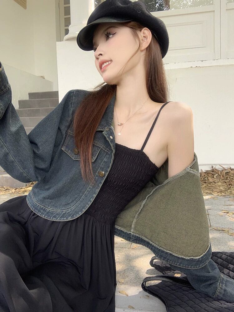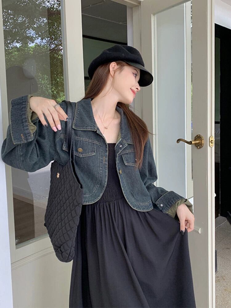 色:デニム長袖カーディガン,ブラックサスペンダースカート,カードカラーサスペンダースカート