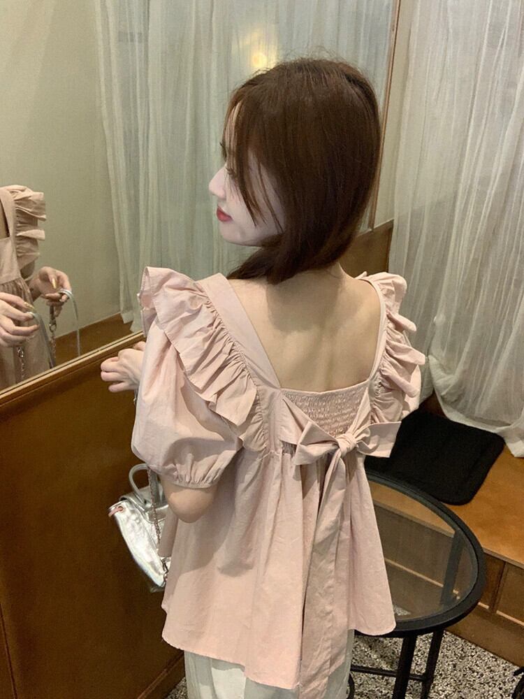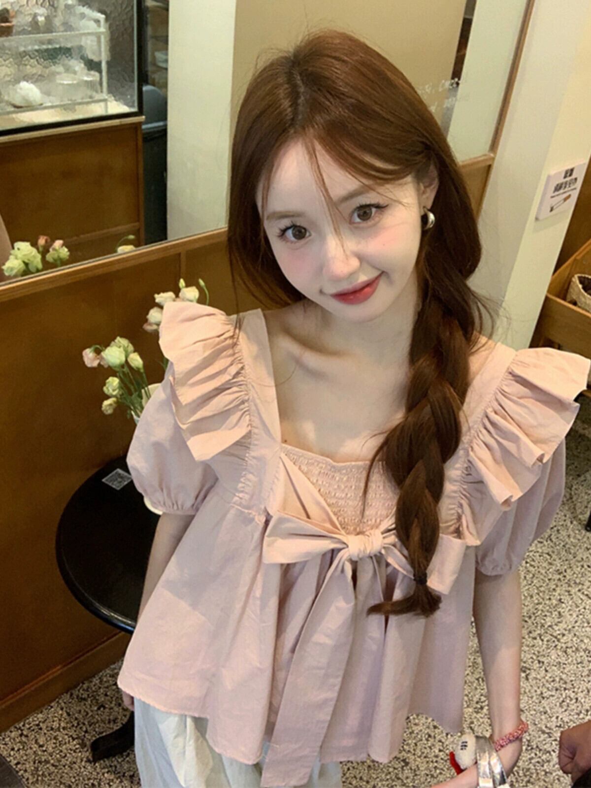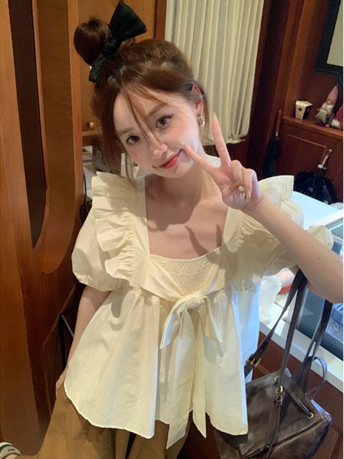 フランスのファッション甘い弓半袖シャツ女性の夏 2023 新しいフリルレースアップ人形シャツイン リボン 大人ガーリー スウィート キュート カジュアル サマー 夏物 missk80320961243