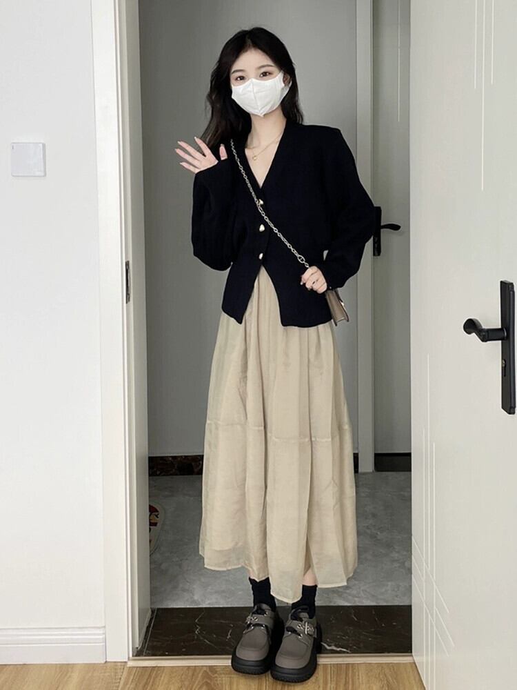 優しいスタイル V ネック長袖ニットカーディガンミドル丈スカート女性の夏の 2023 新しい甘いファッションスーツ ロング 大人ガーリー スウィート キュート カジュアル サマー 夏物 Vネック missk30352936301