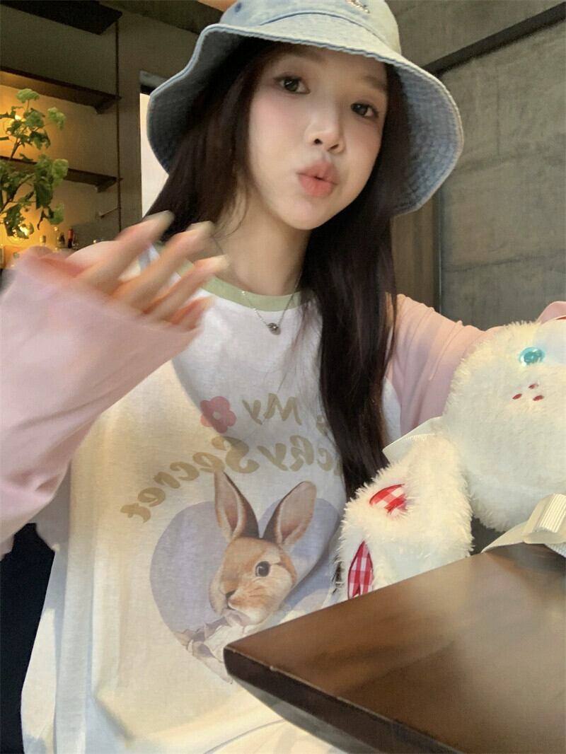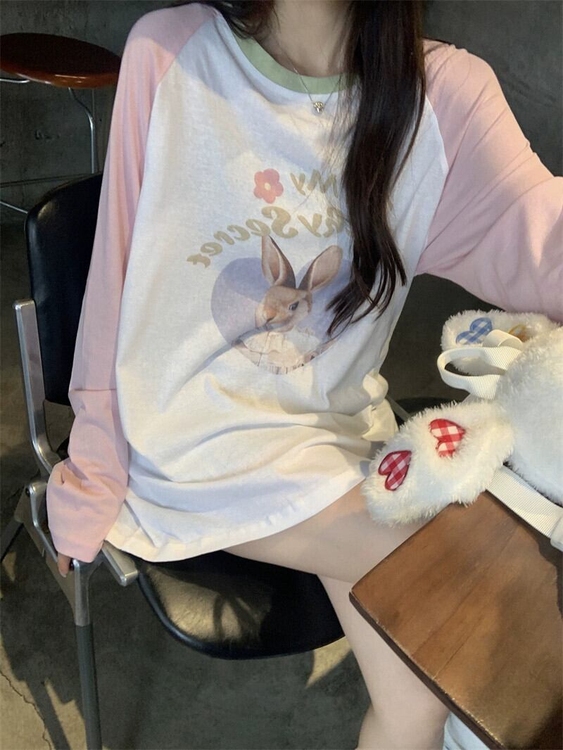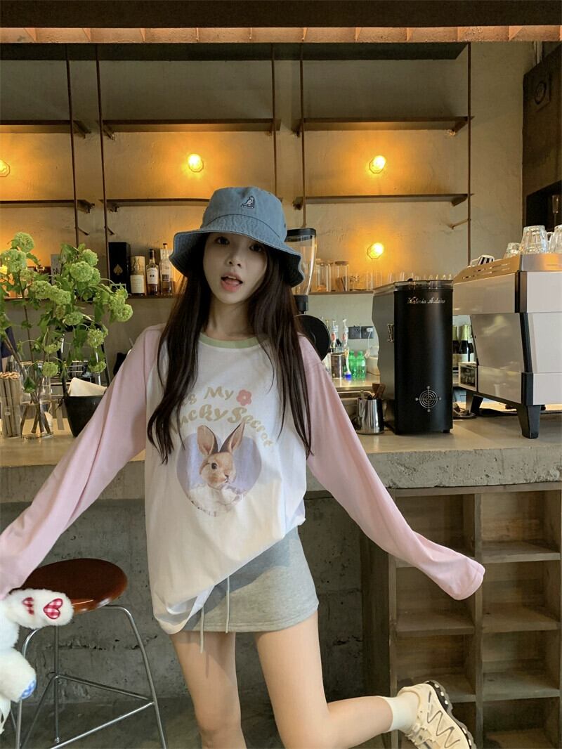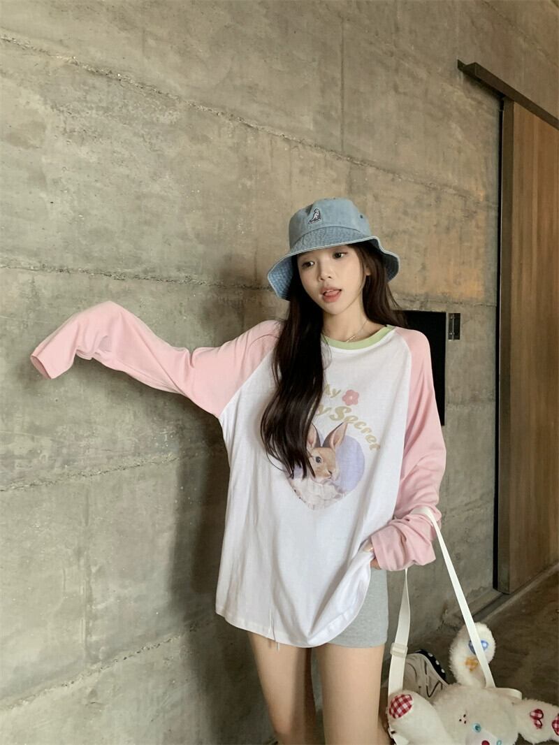 甘いカラーブロック長袖 Tシャツ女性 2023 秋の新しい薄い漫画プリントルーズミッドレングス日焼け防止トップ ロング 大人ガーリー スウィート キュート カジュアル オータム 秋物 missk13814719699