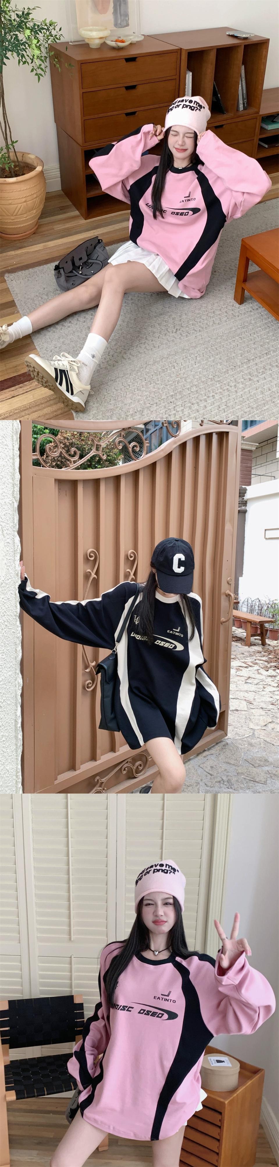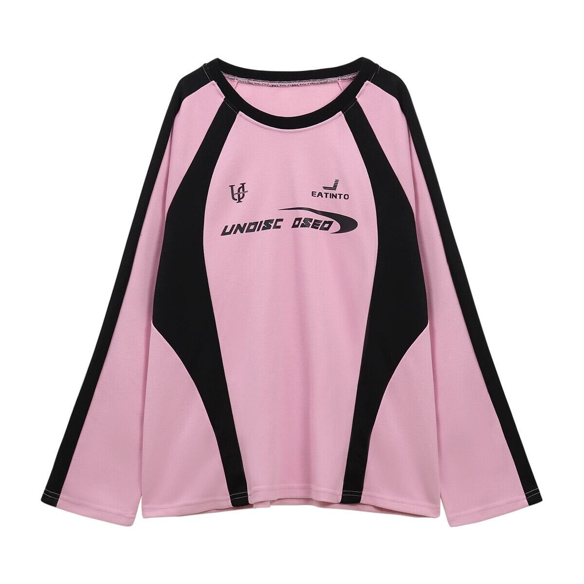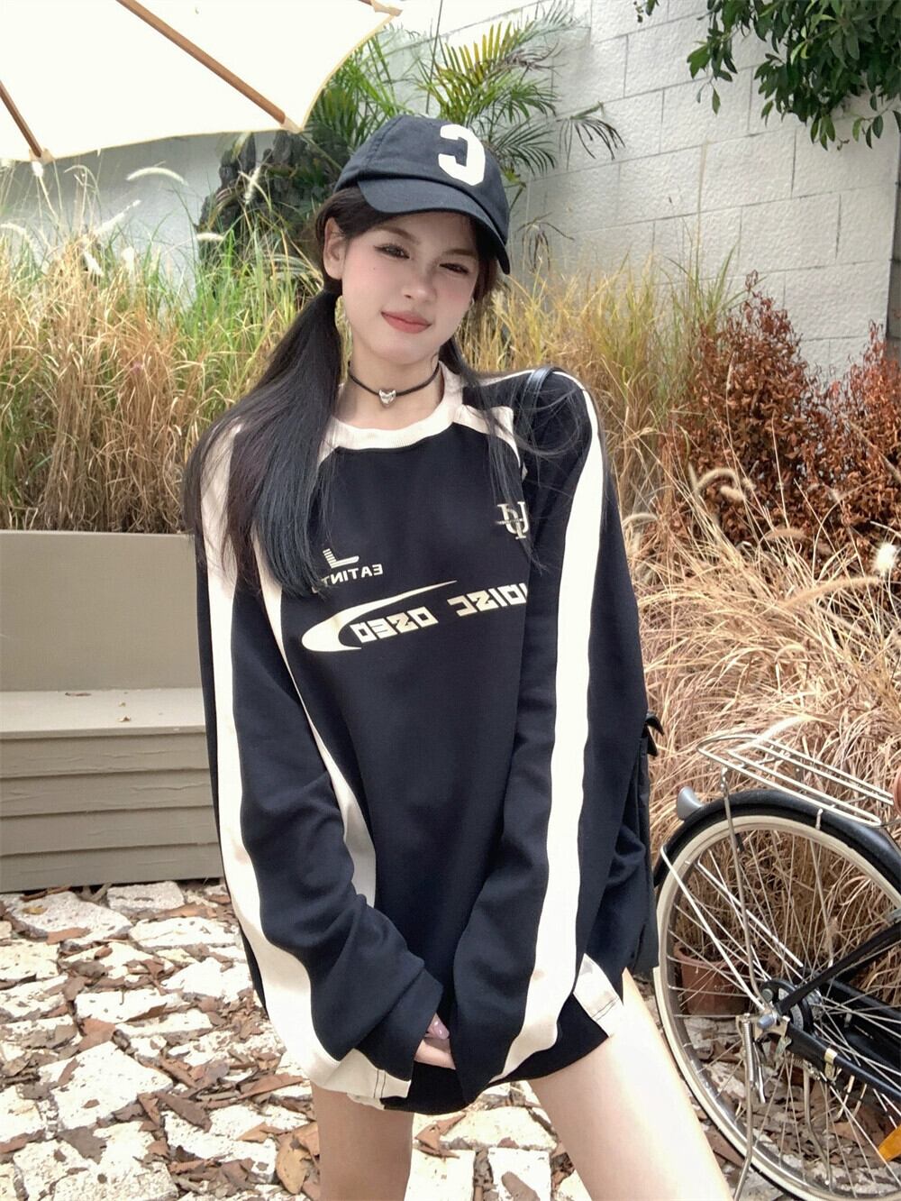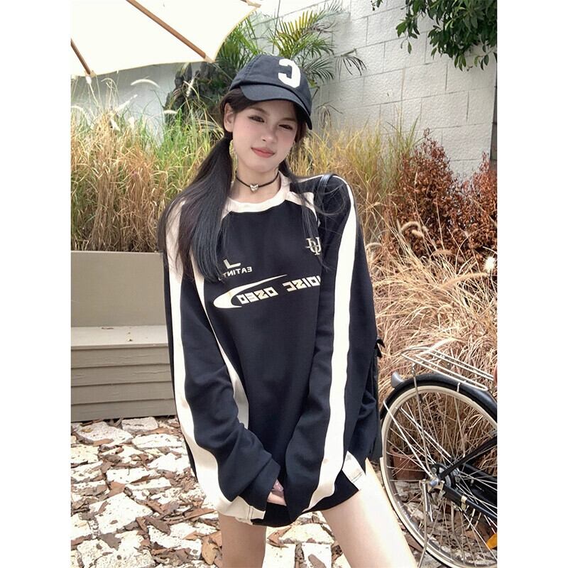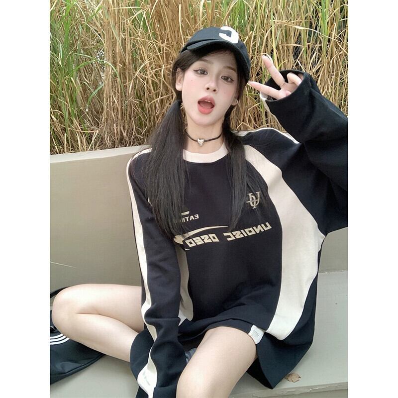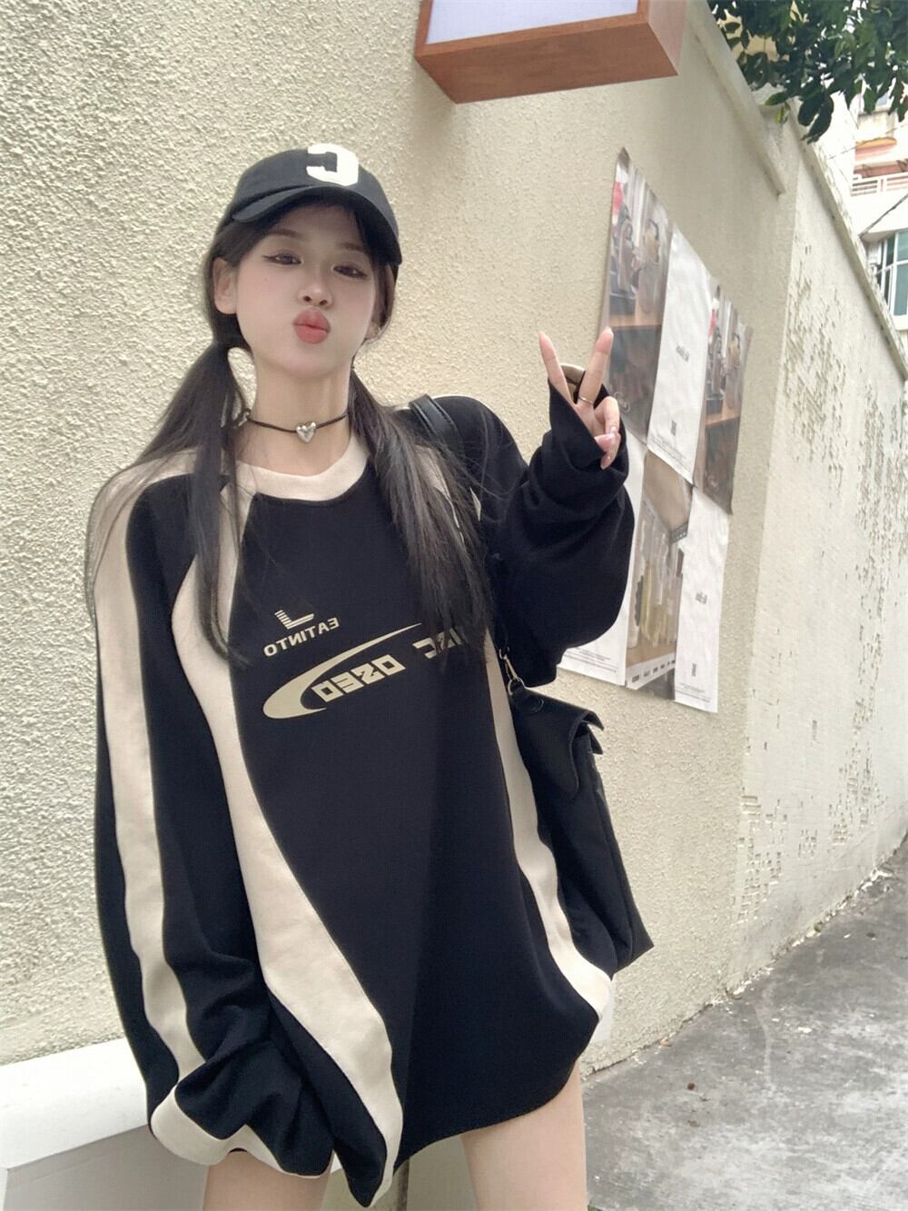 アメリカンスポーツスタイルの長袖Tシャツの女性、2023年秋の新しいスタイルの対照的なカラースプライシングデザイン、ルーズプリントトップトレンディ ロング オータム 秋物 missk26361058377
