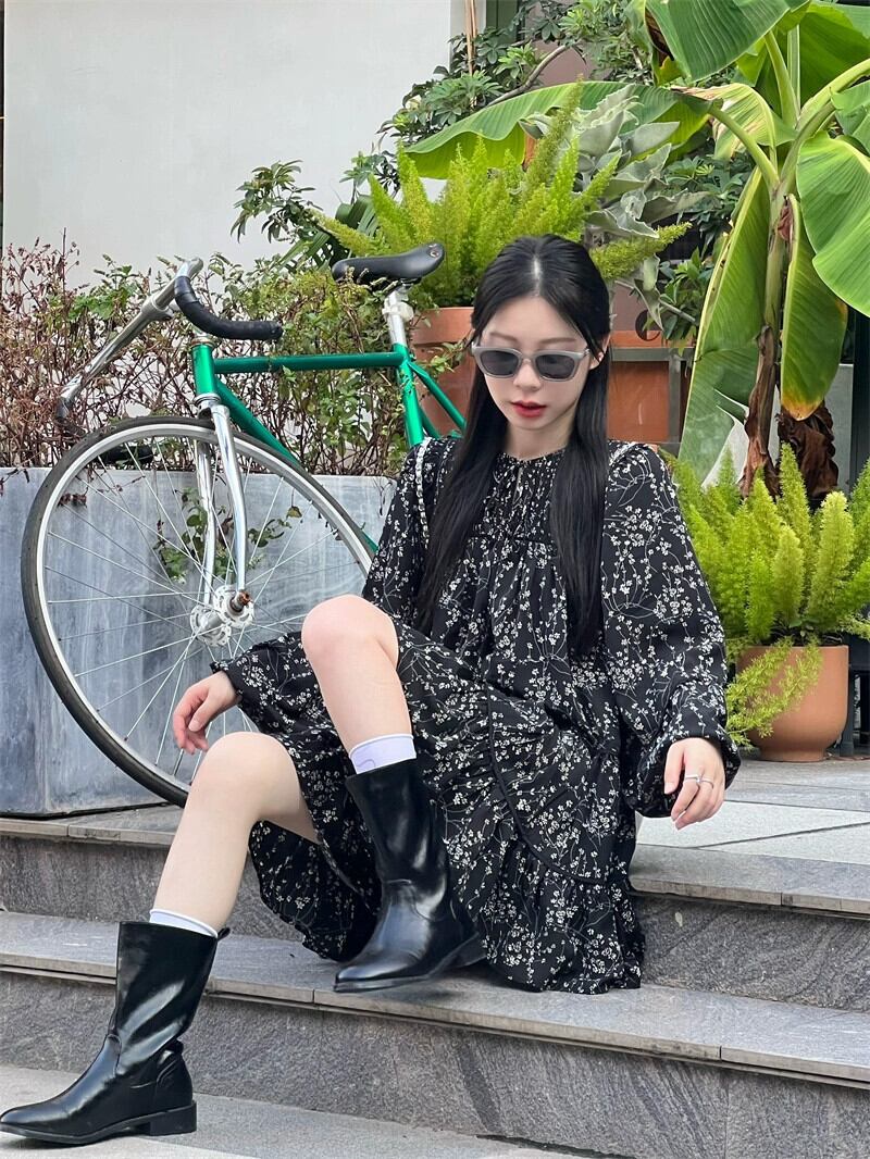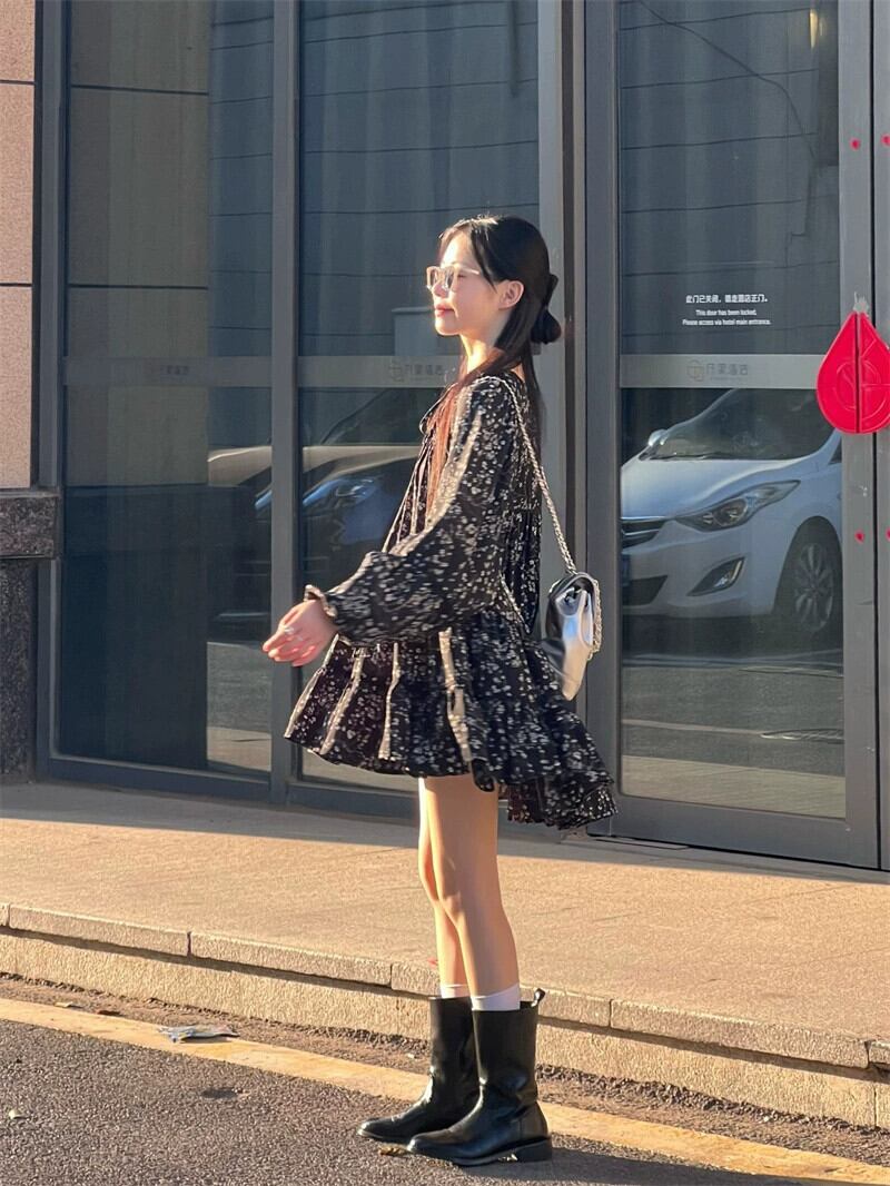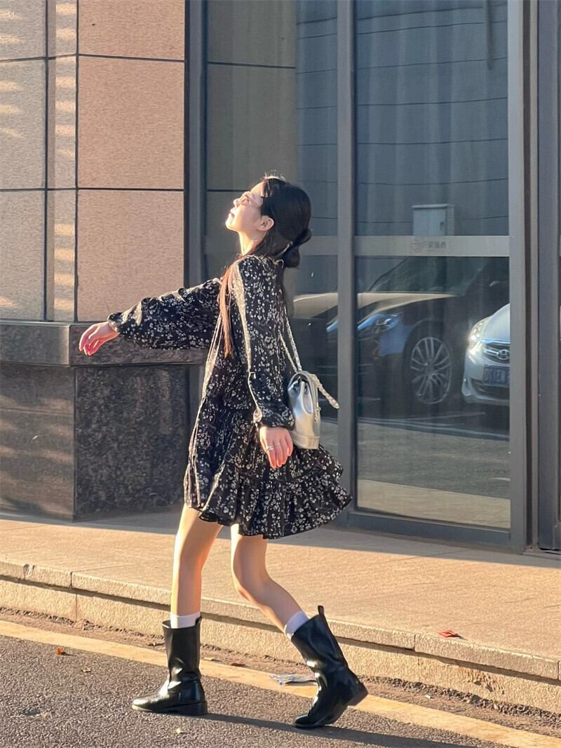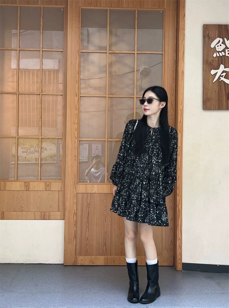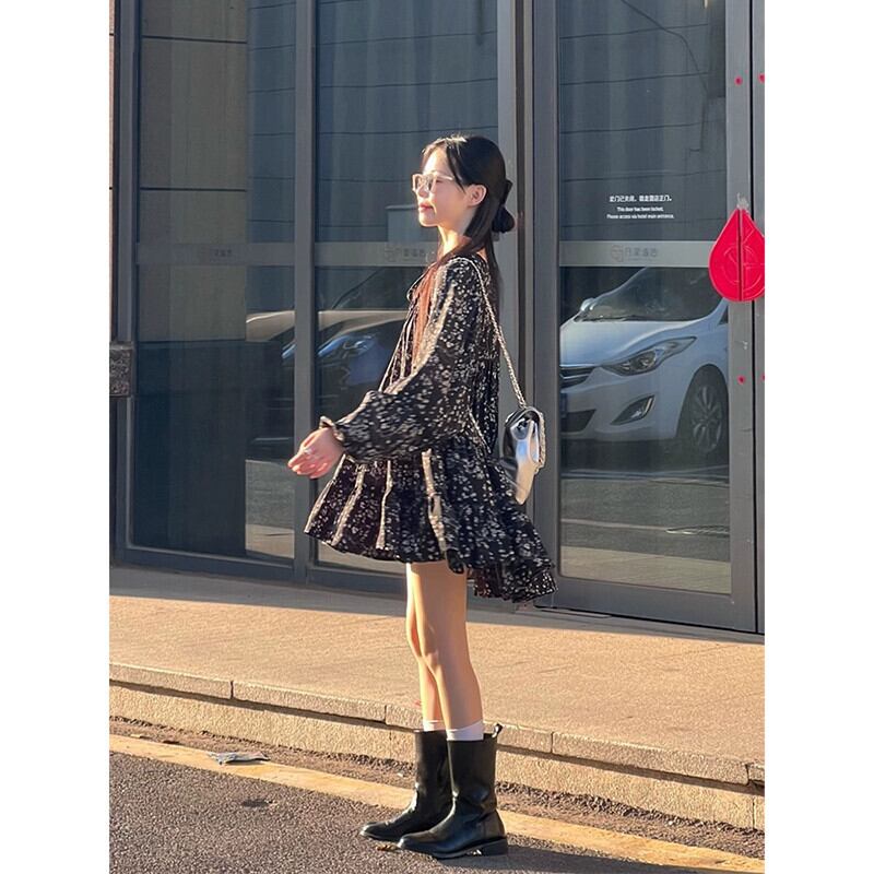 2023年秋の花柄長袖ドレスの女性の新しい甘くてスパイシーなデザインのフリル痩身と年齢を減らすボトムスカート ロング 大人ガーリー スウィート キュート カジュアル オータム 秋物 missk50603724553