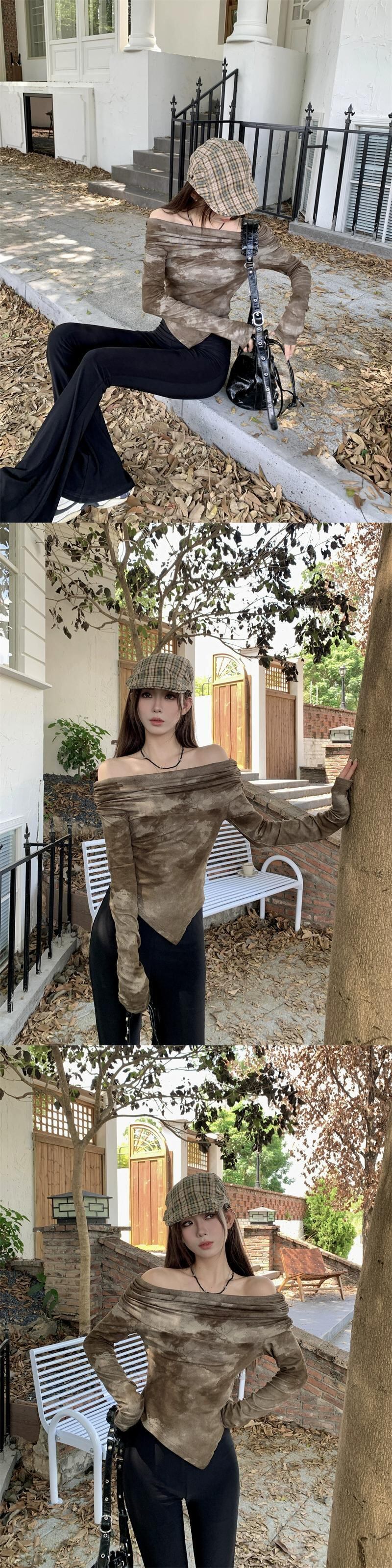 不規則なワンショルダー長袖 T シャツの女性 2023 秋の新しいレトロなネクタイ絞り染めデザインのシックなトップ ロング オータム 秋物 Tシャツ missk30105751859