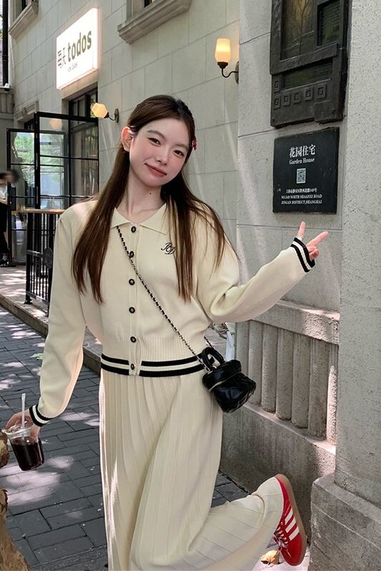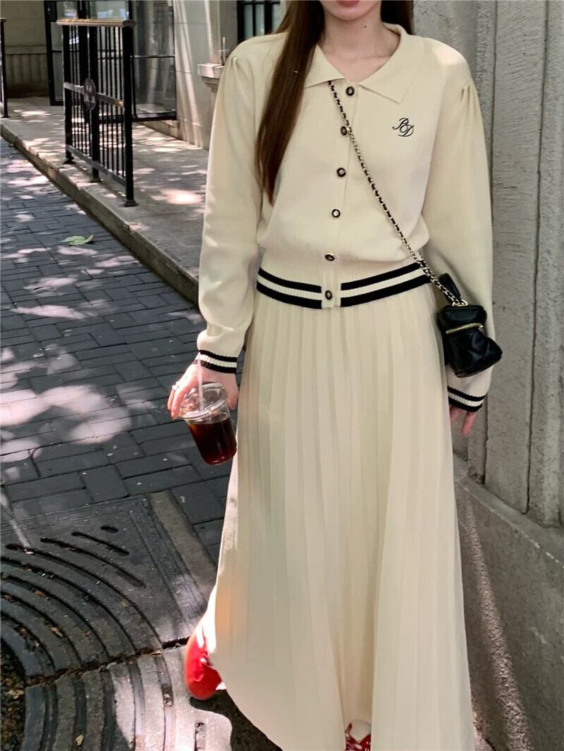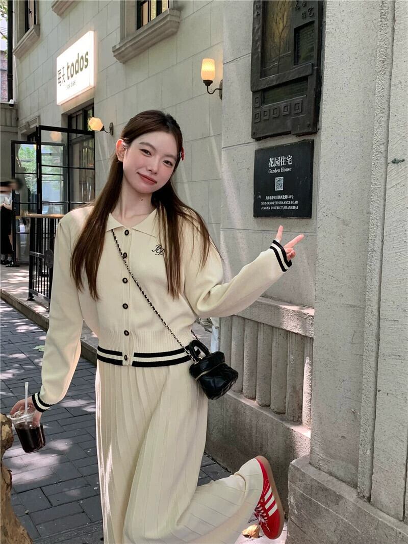 スタイルラペルコントラストカラー長袖ニットカーディガンミッドレングススカート女性秋 2023 新しいファッションスーツ ロング オータム 秋物 missk48178963167