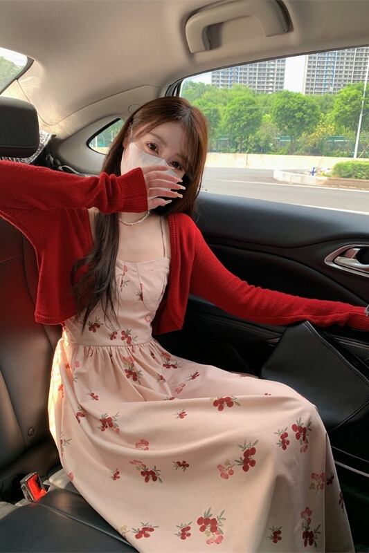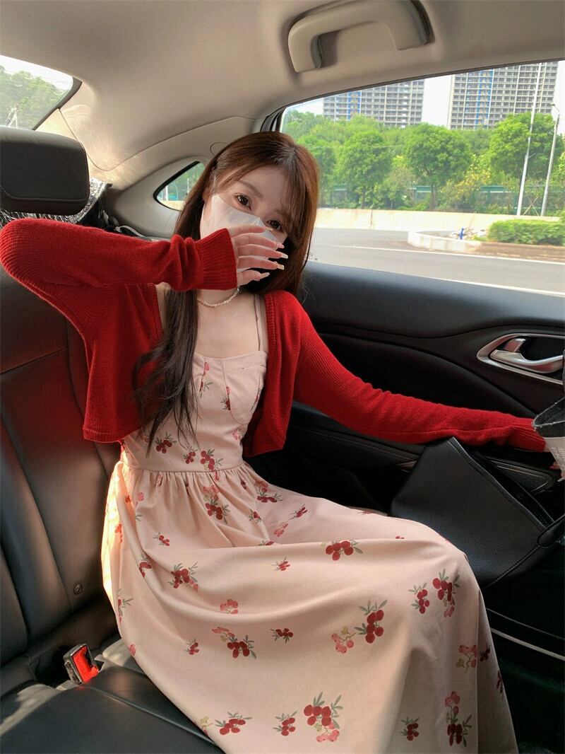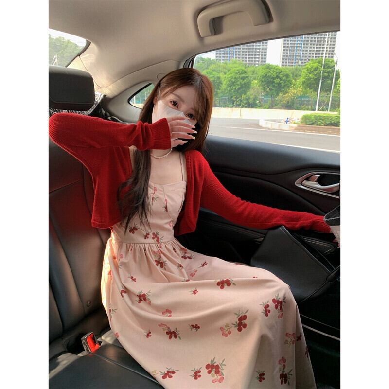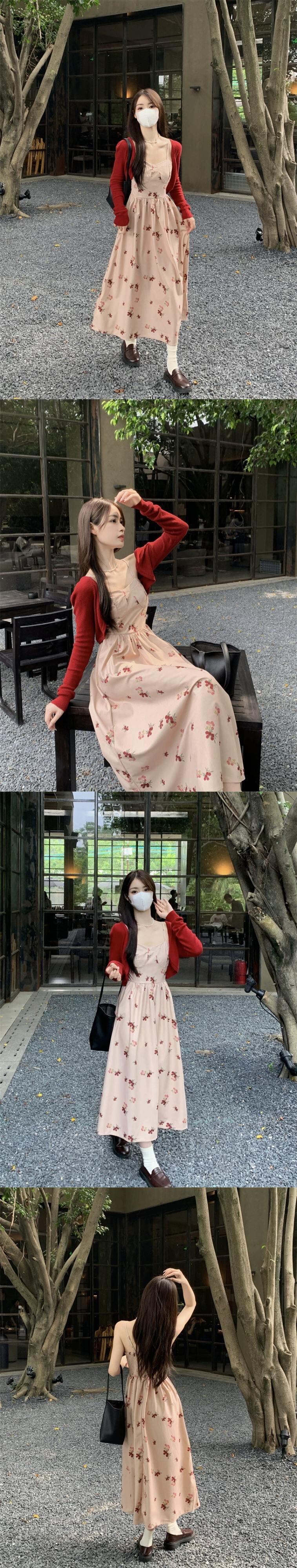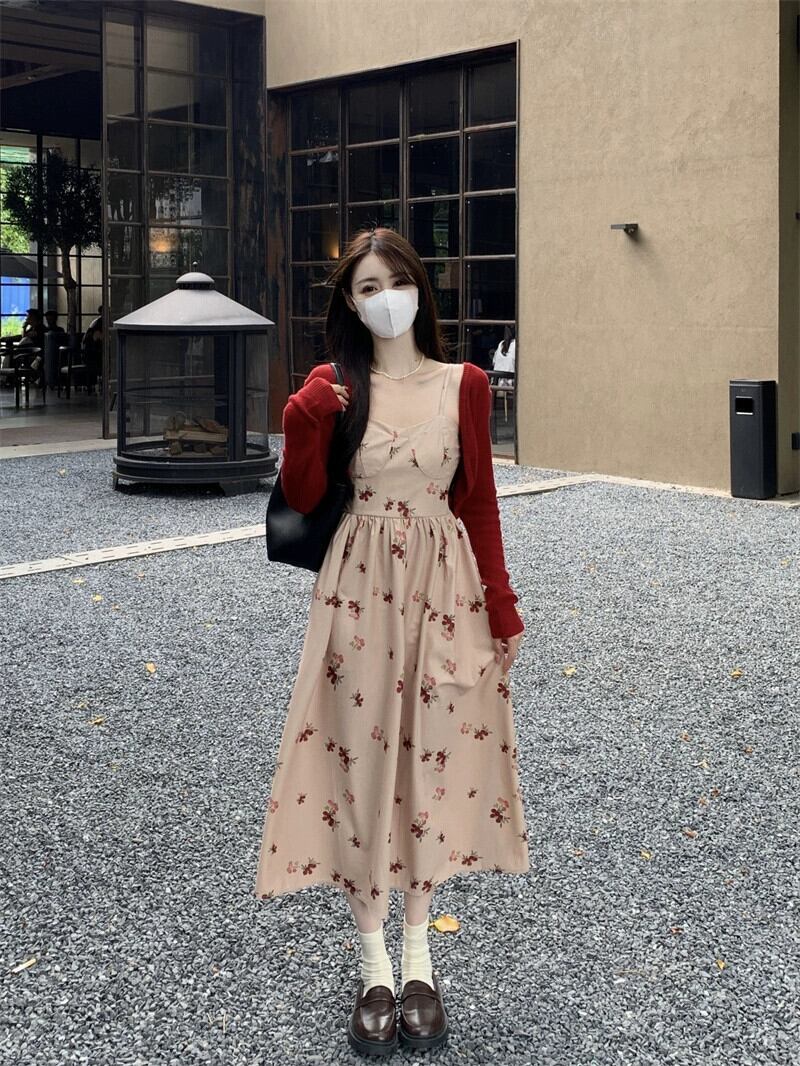 甘いスタイルの優しい花柄ワンピース、2023年秋新作、ウエスト絞りスタイリッシュなAラインサスペンダーミモレ丈スカートレディース 大人ガーリー スウィート キュート カジュアル オータム 秋物 missk55450692813