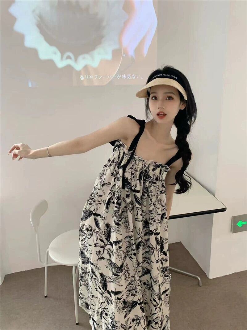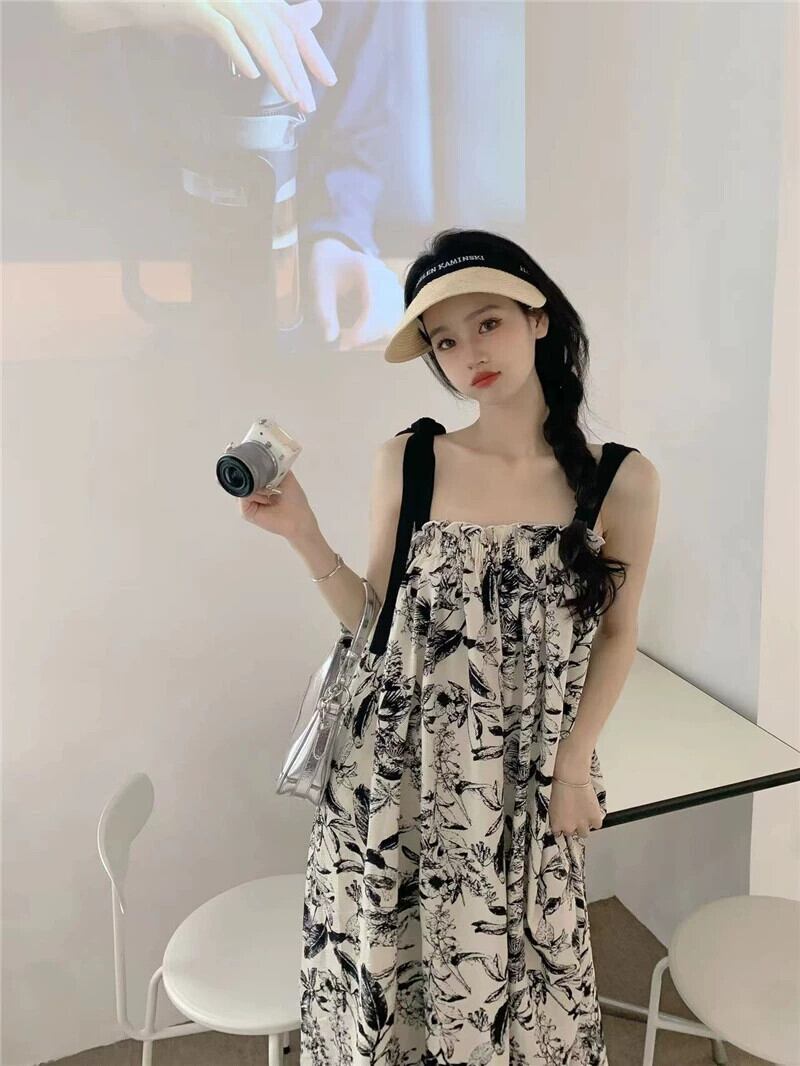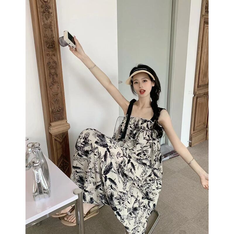 夏 2023 新スタイルフレンチレトロルーズカジュアルインクプリントプリーツデザインストラップサスペンダードレス女性 サマー 夏物 missk74414600906
