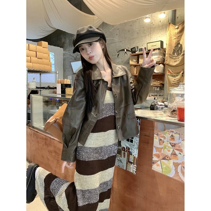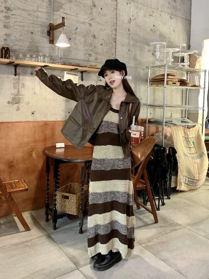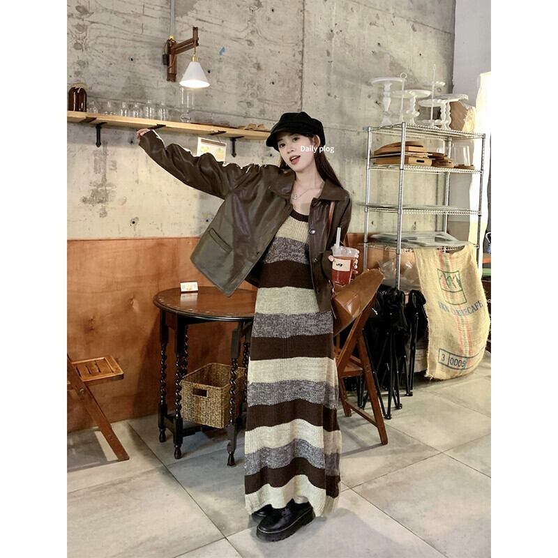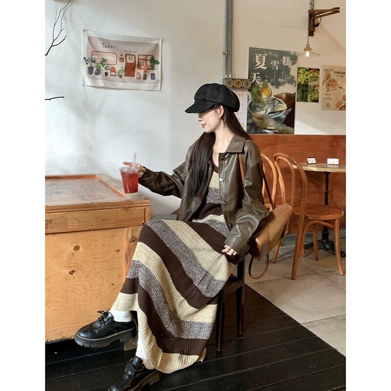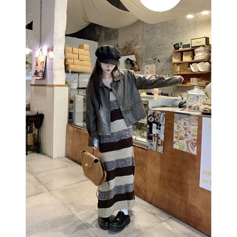 レトロストライプニットサスペンダードレス長袖レザージャケットジャケット女性秋 2023 新しいファッションスーツ ロング オータム 秋物 missk60317642951