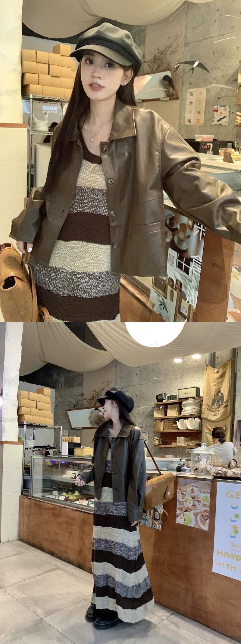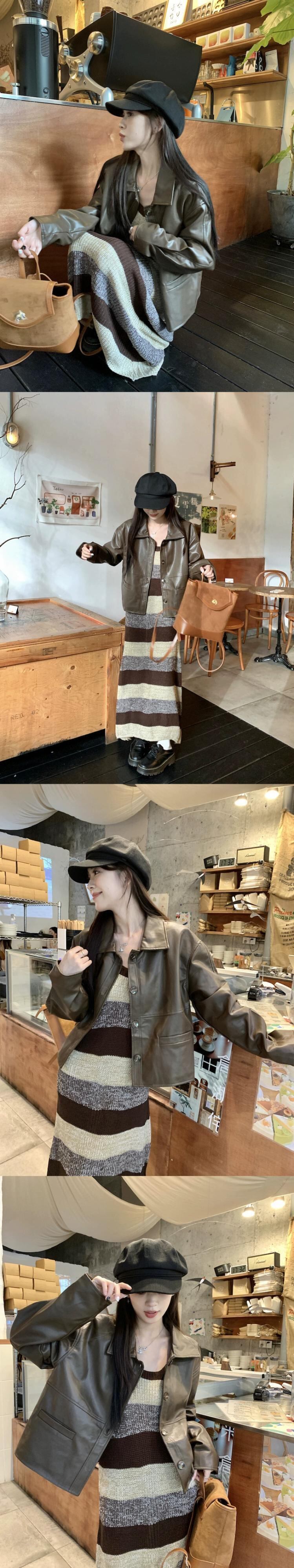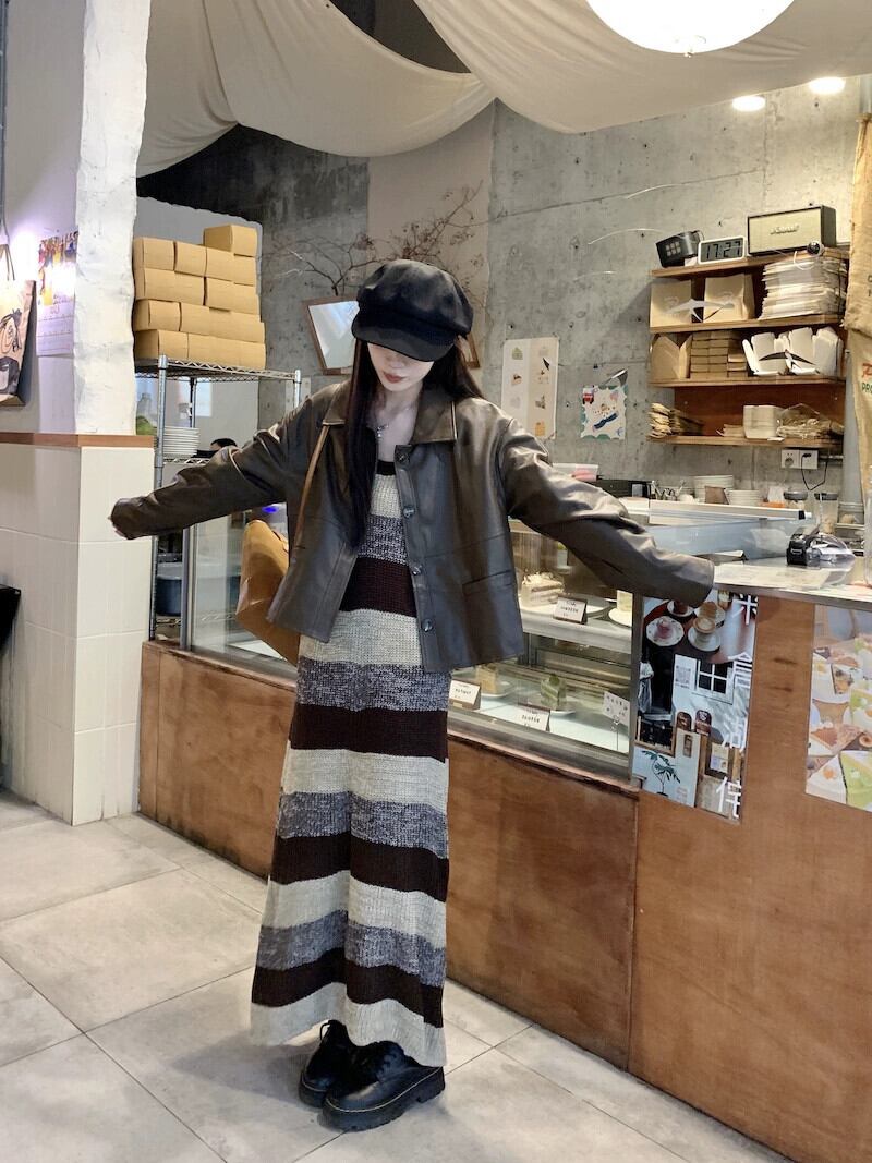 レトロストライプニットサスペンダードレス長袖レザージャケットジャケット女性秋 2023 新しいファッションスーツ ロング オータム 秋物 missk60317642951