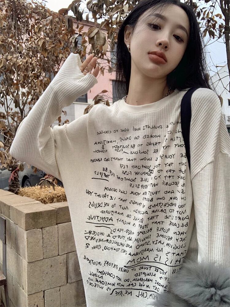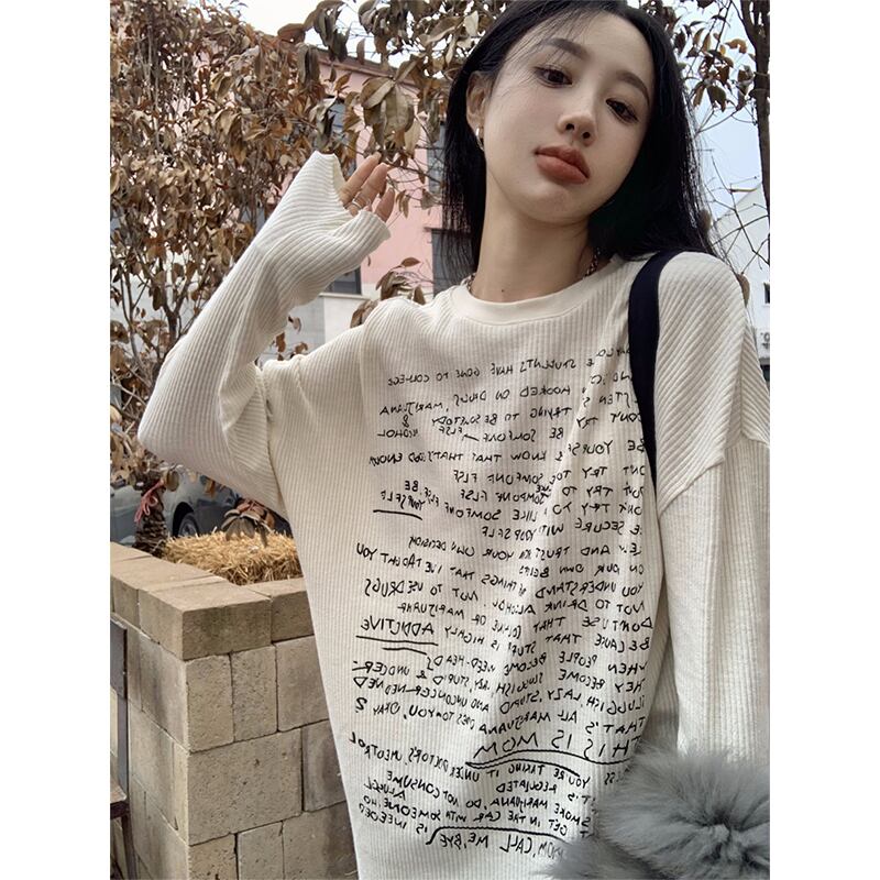 レタープリント長袖ボトシャツ女性秋バージョン 2023 新しいピットストライプルーズインナー Tシャツトップイン ロング オータム 秋物 missk1550070212