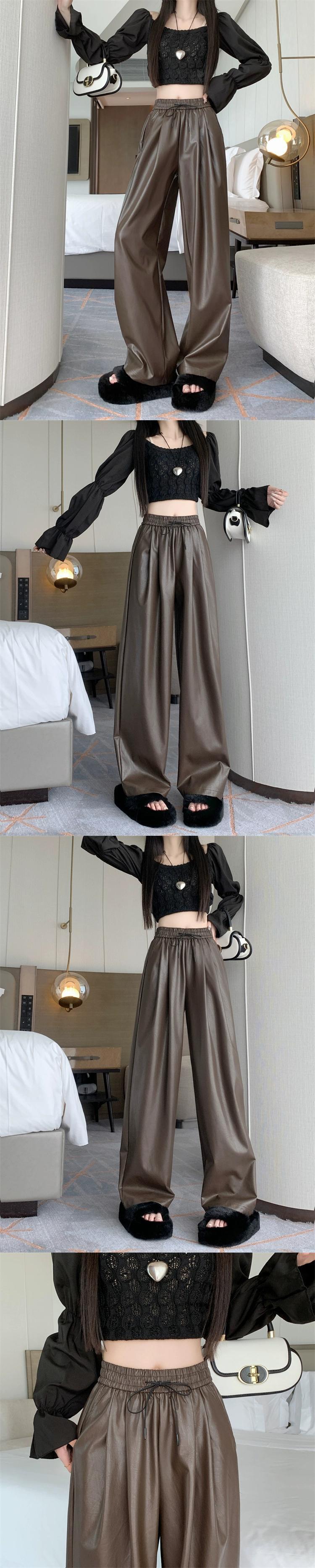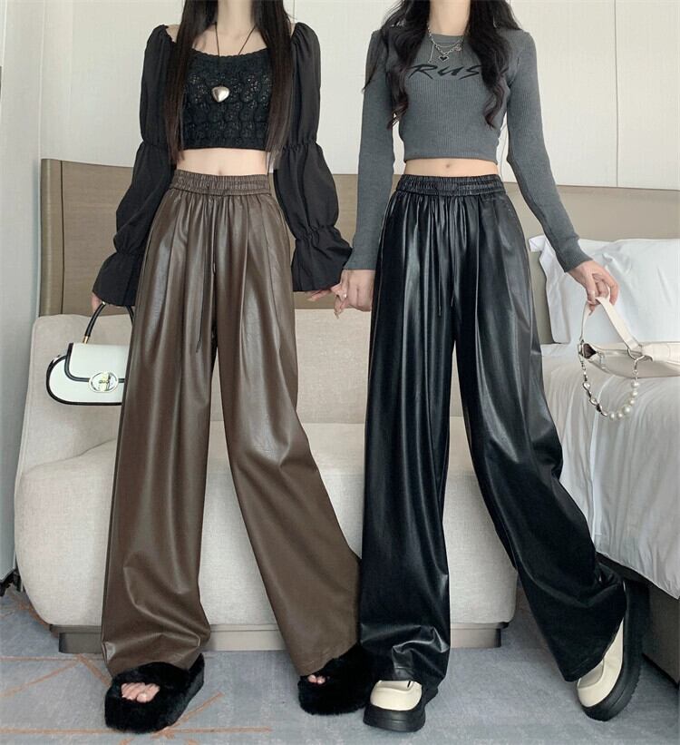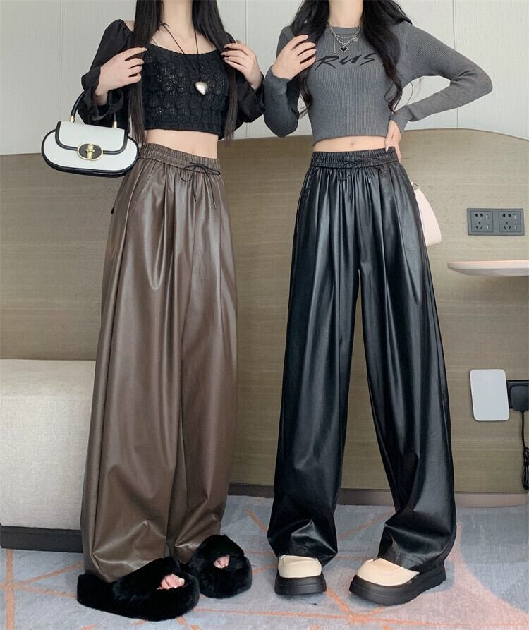Pu レザーワイドレッグパンツの女性秋バージョン 2023 新しいハイウエストスリム巾着弾性デザインカジュアルパンツトレンディ エラスティック 伸縮 オータム 秋物 missk92294782503