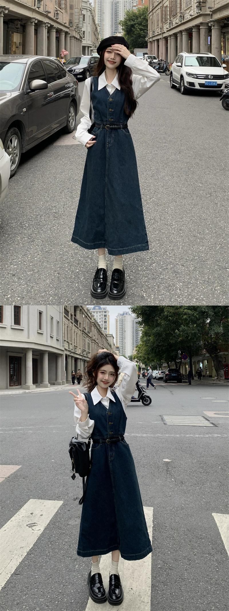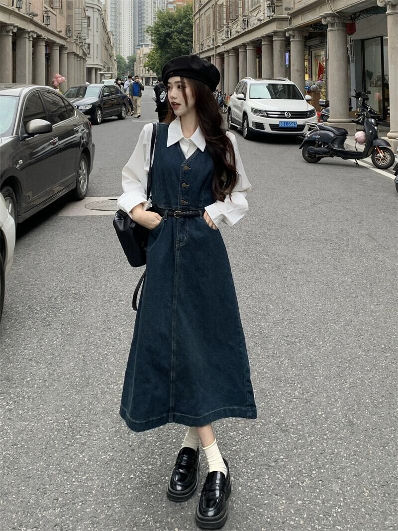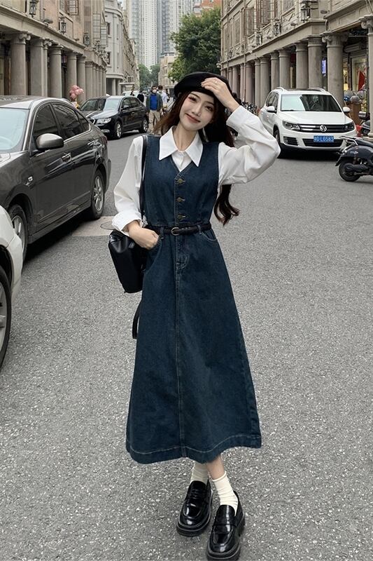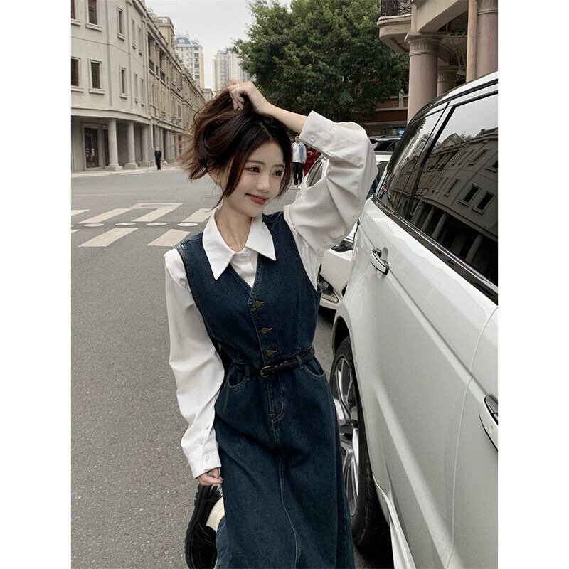 V ネックデニムベストドレス女性秋 2023 新しいレトロミッドレングスウエスト痩身 A ラインロングスカートトレンディな オータム 秋物 Vネック Aライン missk69173041463