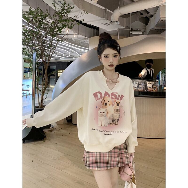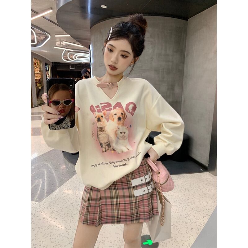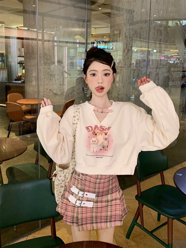 甘い中空デザインプリント長袖トレーナーハイウエストチェック柄スカート女性秋 2023 新しい 2 点セット ロング 大人ガーリー スウィート キュート カジュアル オータム 秋物 missk23186702947