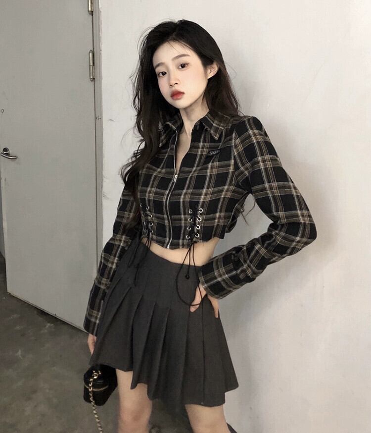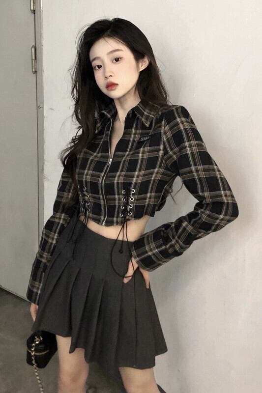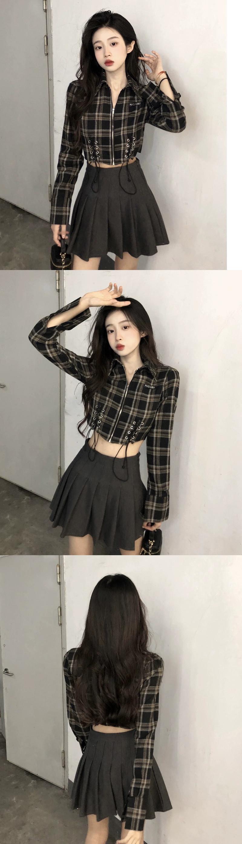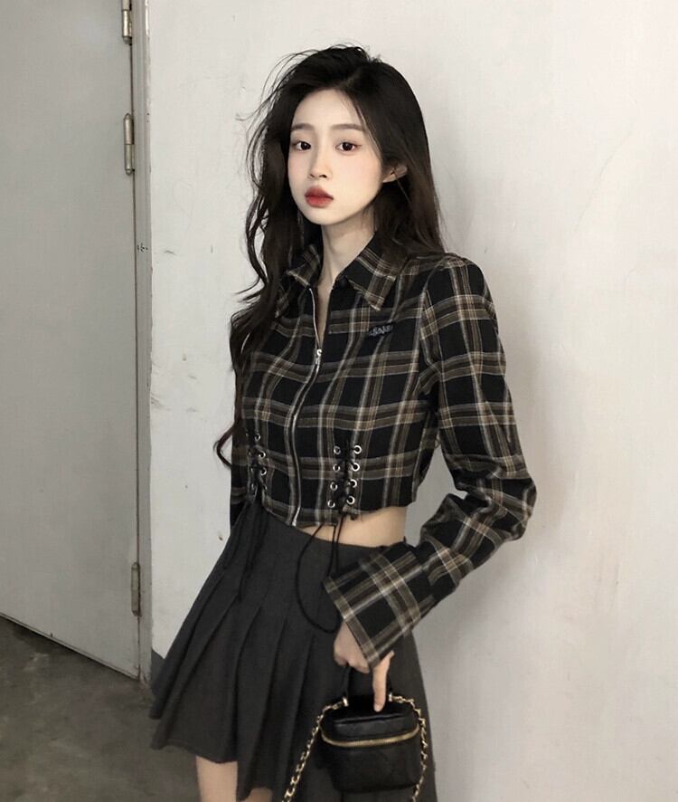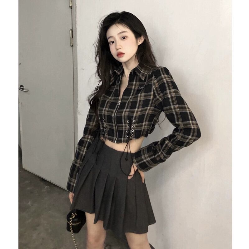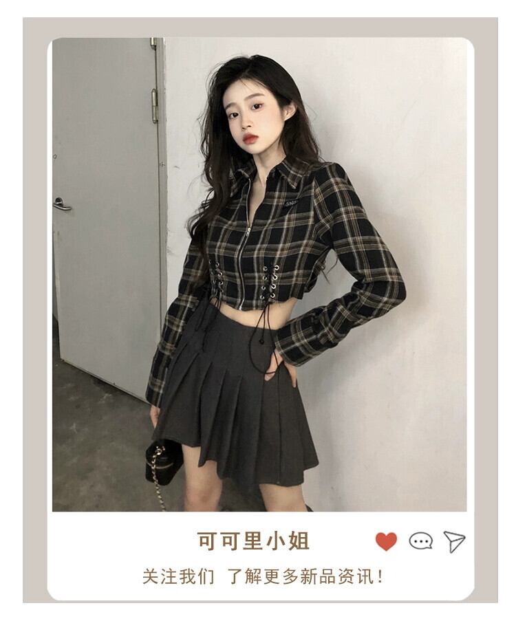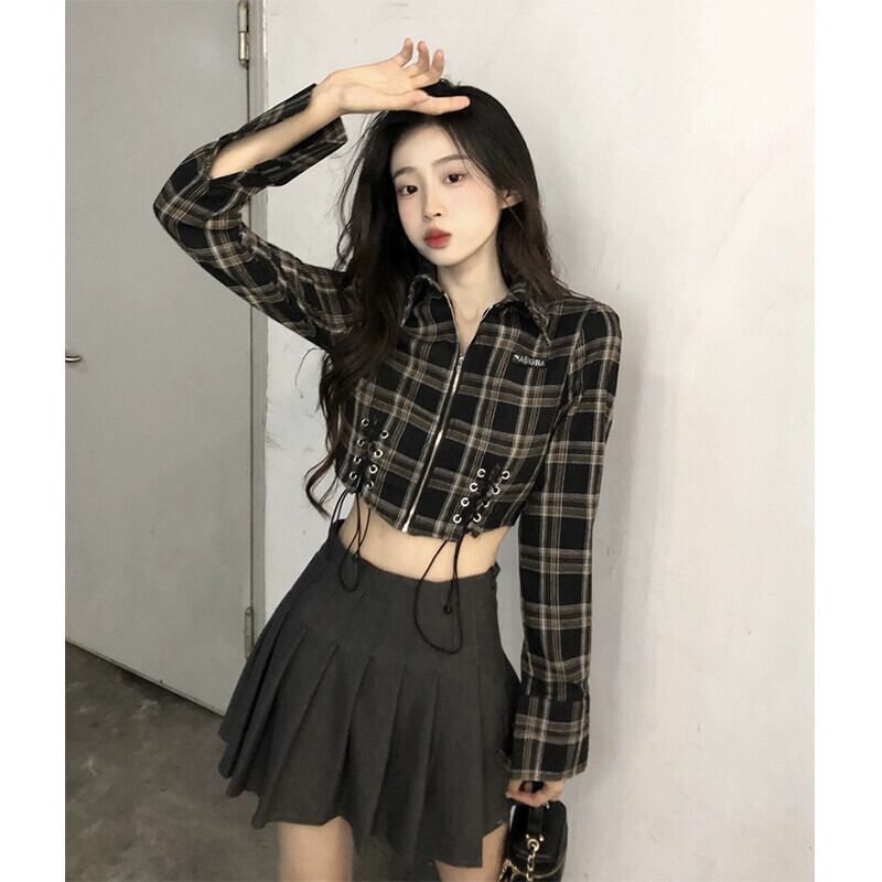 スイートクールホットガールチェック柄シャツ女性の秋 2023 ストラップショートスリム長袖日焼け止めトップ ロング 大人ガーリー スウィート キュート カジュアル オータム 秋物 missk57416686079