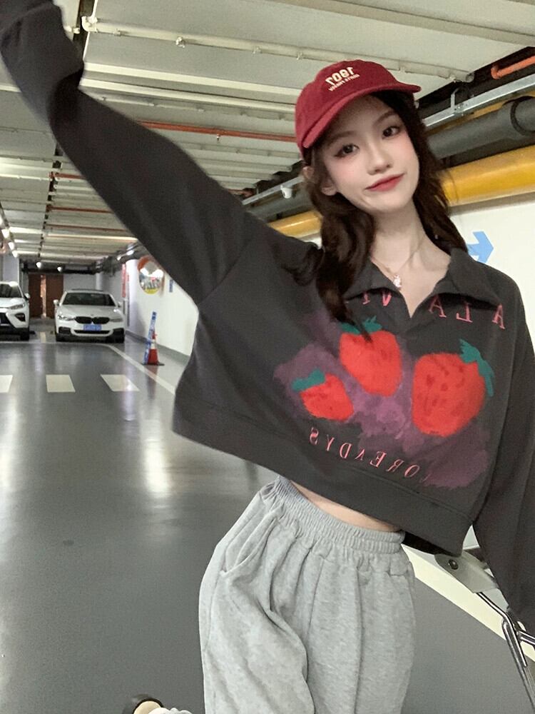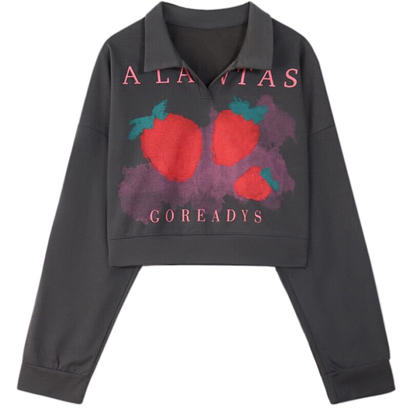 有能水彩イチゴプリントポロカラー長袖スウェットシャツミスココリショートトップ女性の秋の新しいスタイル ロング オータム 秋物 missk62791982753