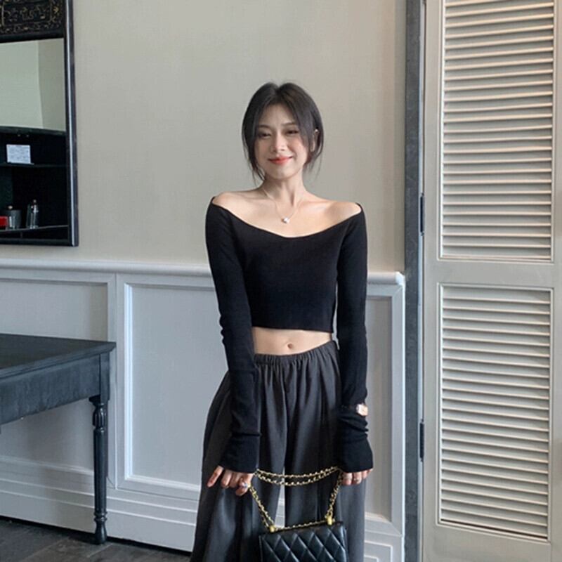 ホットスタイルワンショルダーショート Tシャツ 2023 秋の新ファッションスリム BM 気質長袖女性のブラックトップ ロング オータム 秋物 missk26394033041