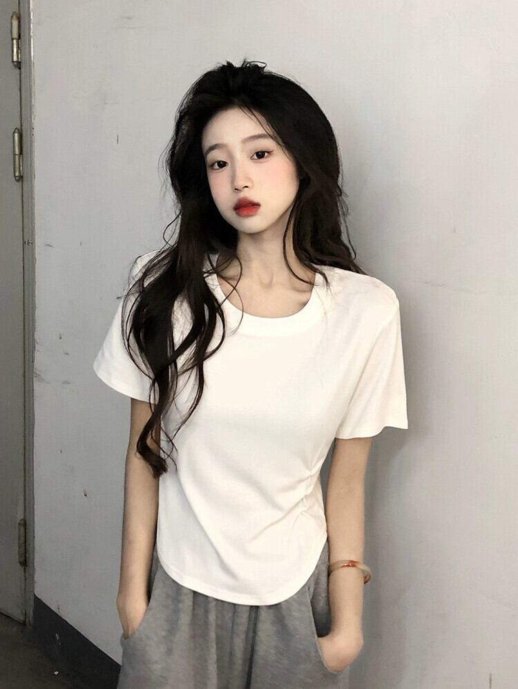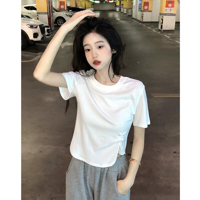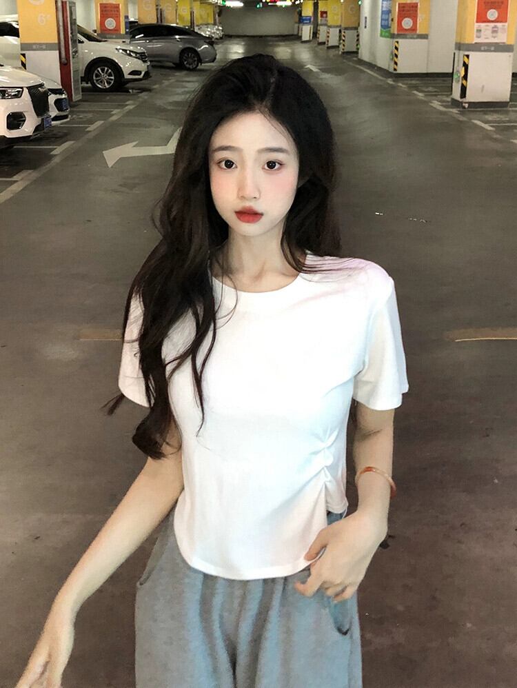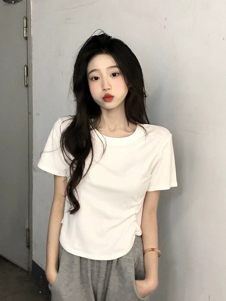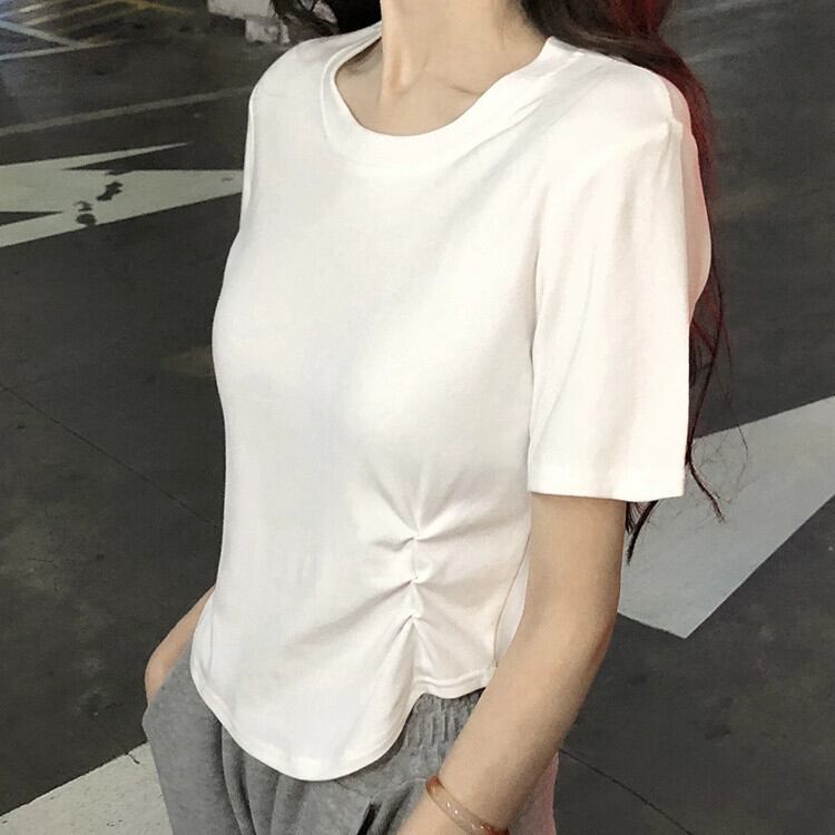 ホワイトプリーツデザインショート Tシャツ夏 2023 新しいスリムスリムファッションインスタイル半袖トップ女性 サマー 夏物 missk21102697222