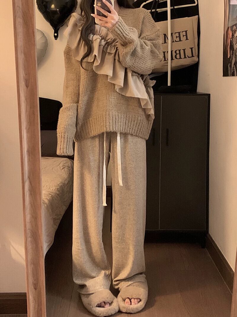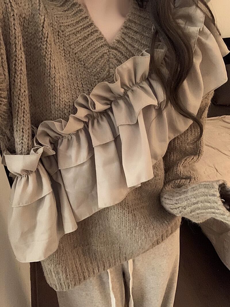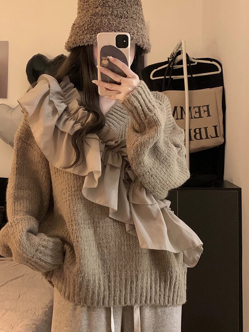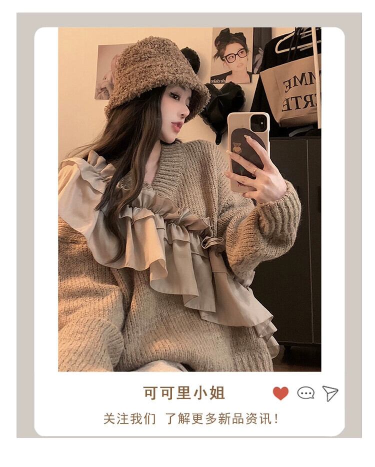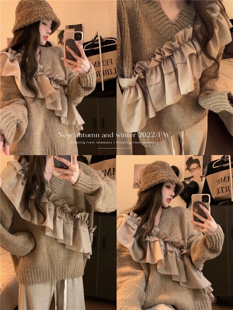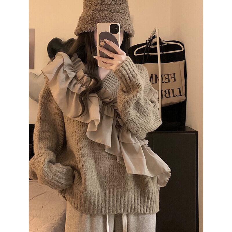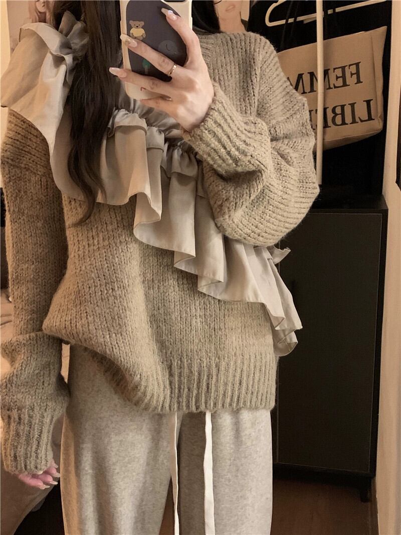 怠惰なスタイルのデザインレーススプライシングプルオーバーセーター女性の秋冬 2023 新しいルーズ長袖ニットトップ ロング オータム 秋物 ウィンター 冬物 missk20628820064