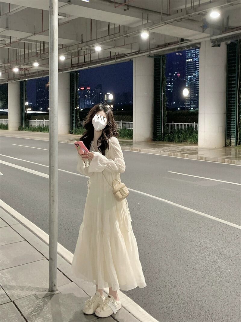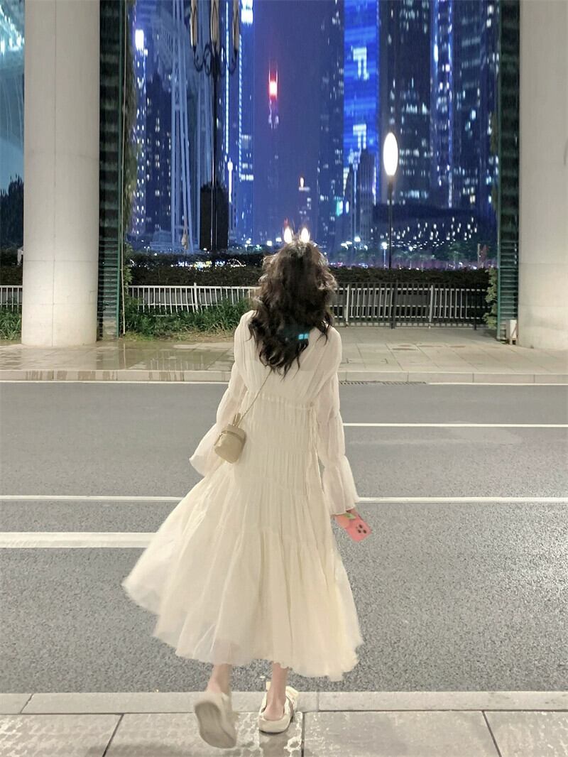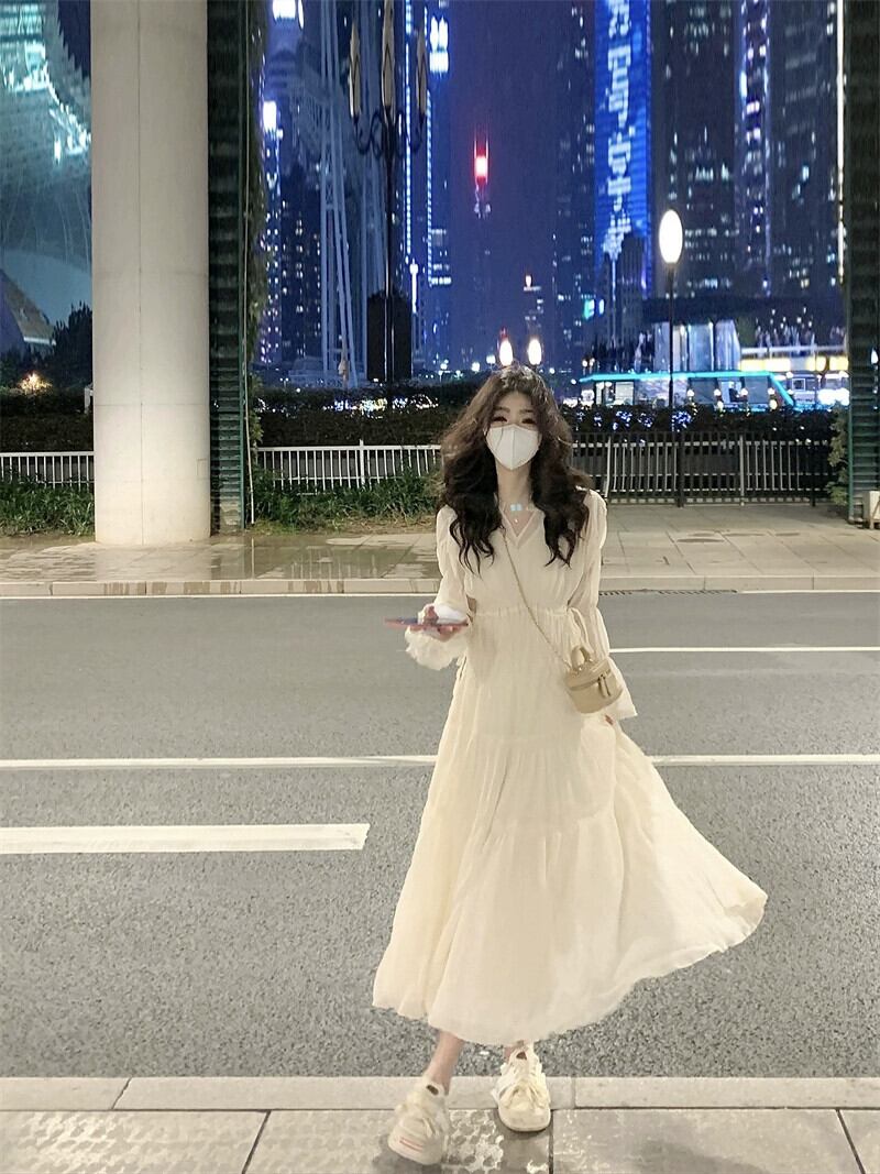 ベルスリーブフレンチ V ネックティーブレイクドレス 2023 秋の新しいスタイルのウエスト痩身ミッドレングス長袖フェアリードレス ロング オータム 秋物 Vネック missk67089452939