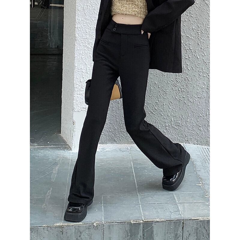 黒のストレッチカジュアルパンツの女性、秋バージョン2023新しいハイウエストスリム2ボタンデザインストレートパンツ ブラック オータム 秋物 missk33658240308
