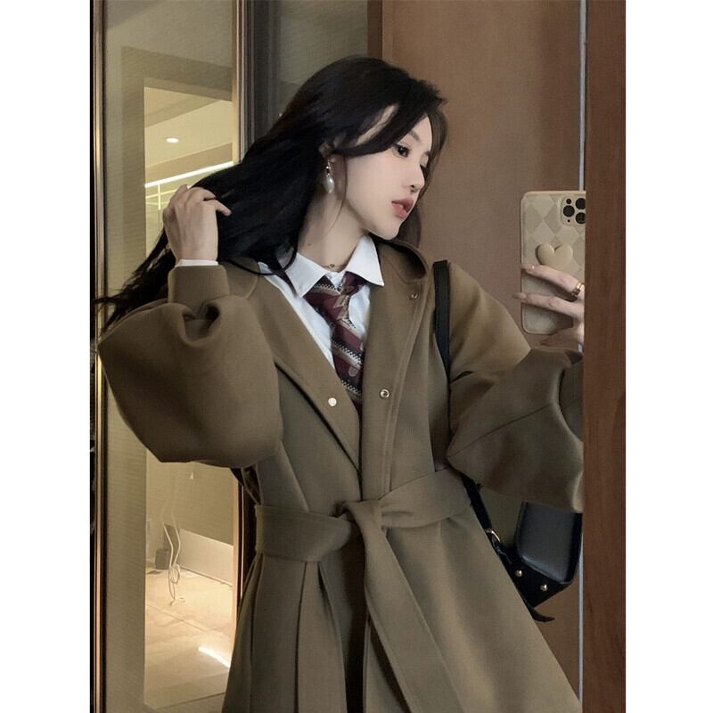 ランタンスリーブウールコートの女性の冬 2023 新しいレトロなデザインのフード付きウエスト小さな長袖ウインドブレーカー ロング ウィンター 冬物 missk40102825977