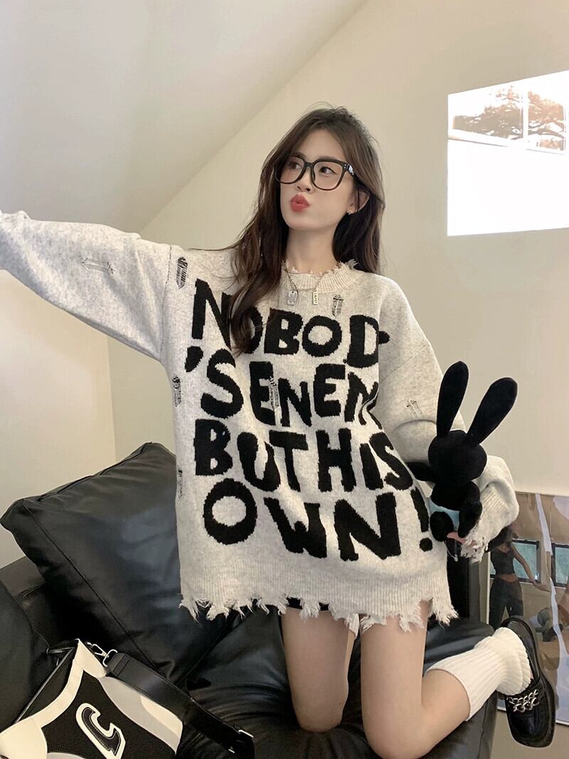 アメリカンスタイルの破れたセーターの女性の秋と冬2023新しいデザインレタールーズミッドレングス長袖ニットトップトレンディ ロング オータム 秋物 ウィンター 冬物 missk62295785461