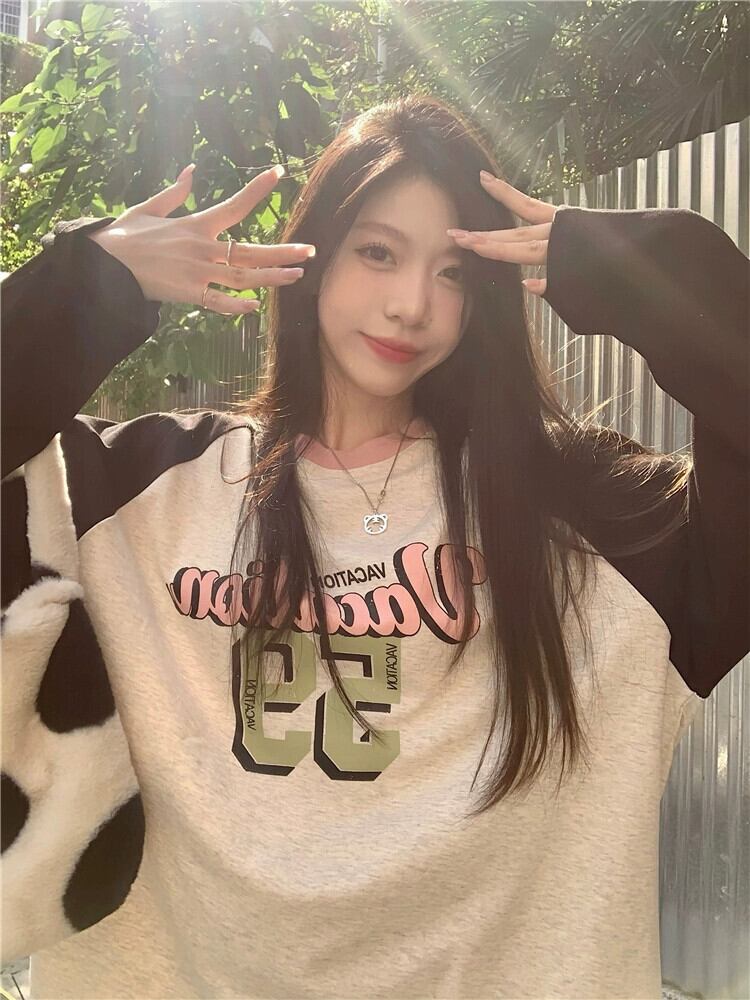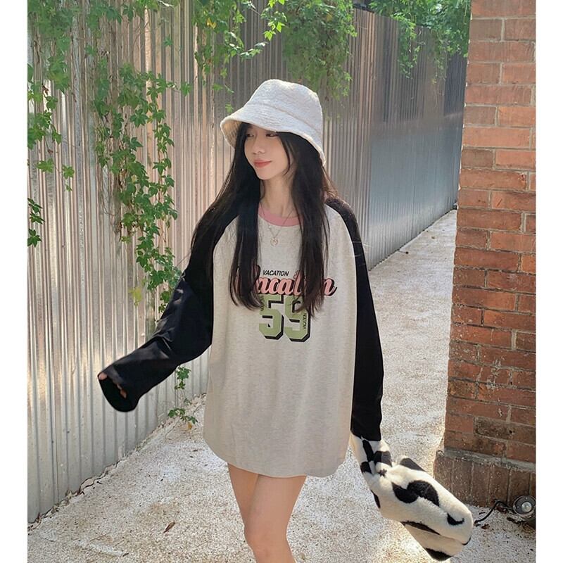 アメリカラグランスリーブ Tシャツ女性の夏 2023 コントラストカラールーズミッドレングスレタープリント長袖トップトレンディ ロング サマー 夏物 missk87330056380