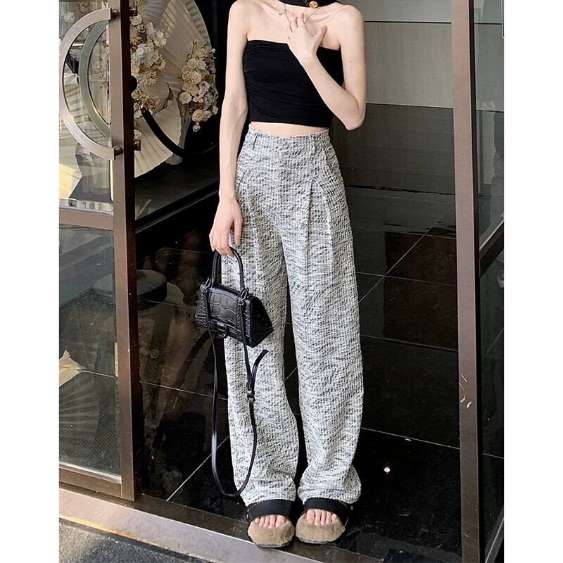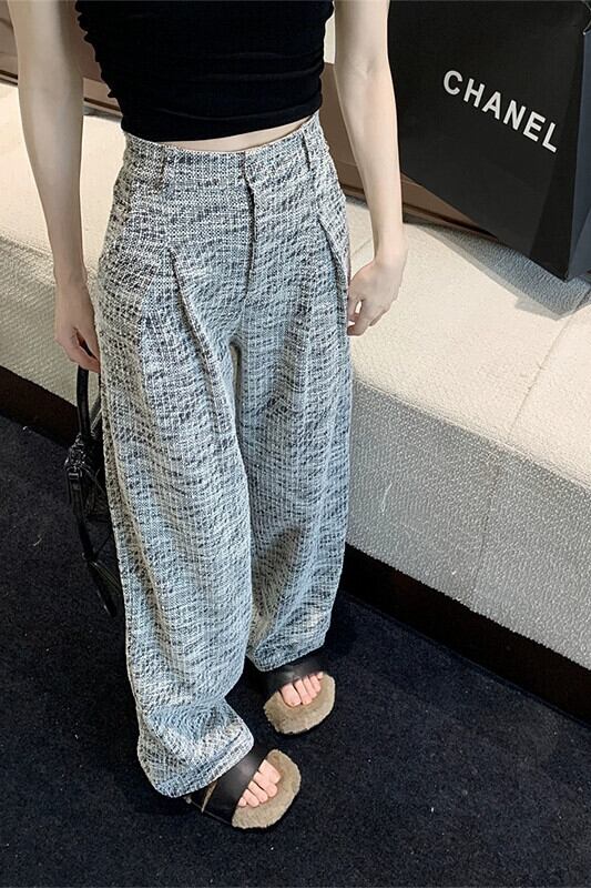 ツイードチェック柄ワイドレッグパンツ女性秋バージョン 2023 新しいハイウエスト痩身デザインフロアレングスカジュアルパンツ オータム 秋物 missk18003756245