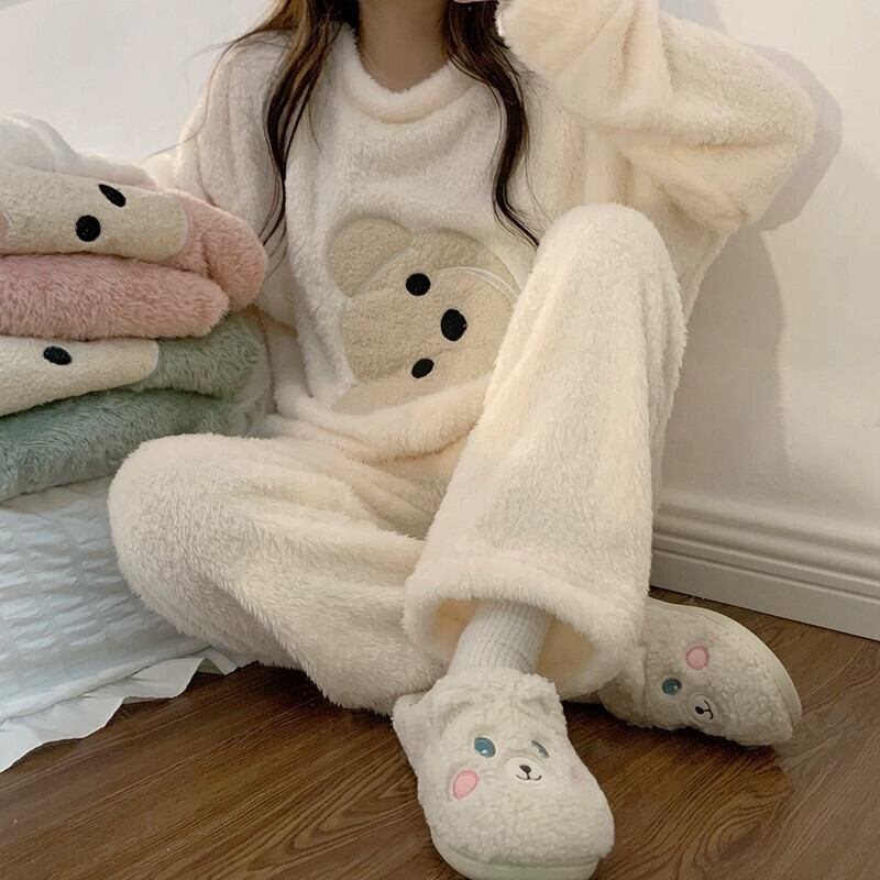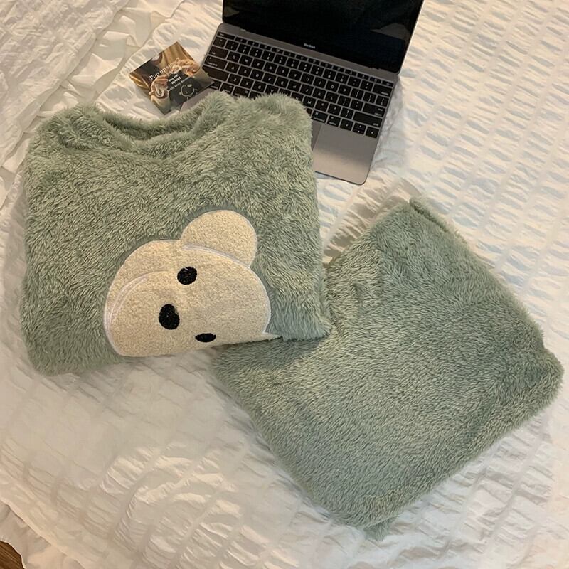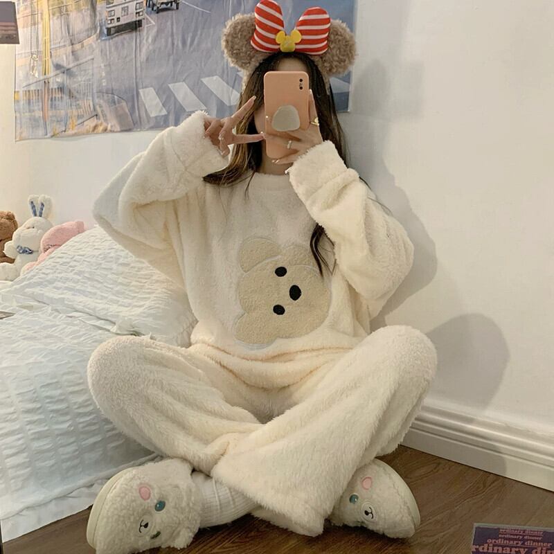 かわいいクマサンゴベルベットのパジャマパンツスーツ女性の秋と冬の 2023 新しい暖かいカジュアルホームウェア 2 点セット 大人ガーリー スウィート キュート オータム 秋物 ウィンター 冬物 missk32162863963