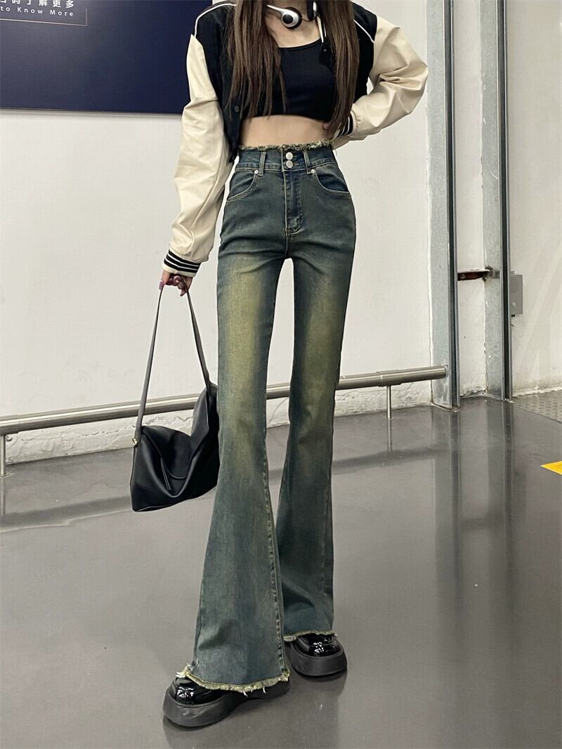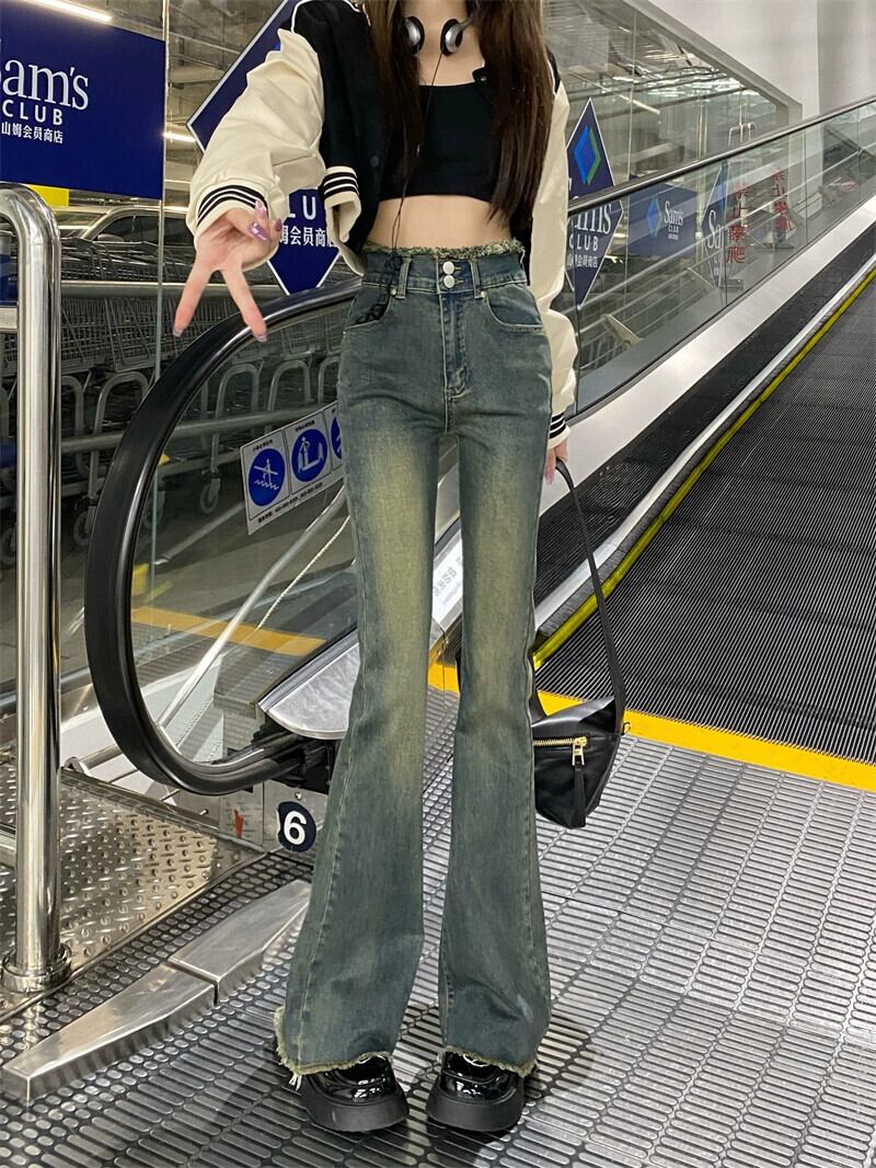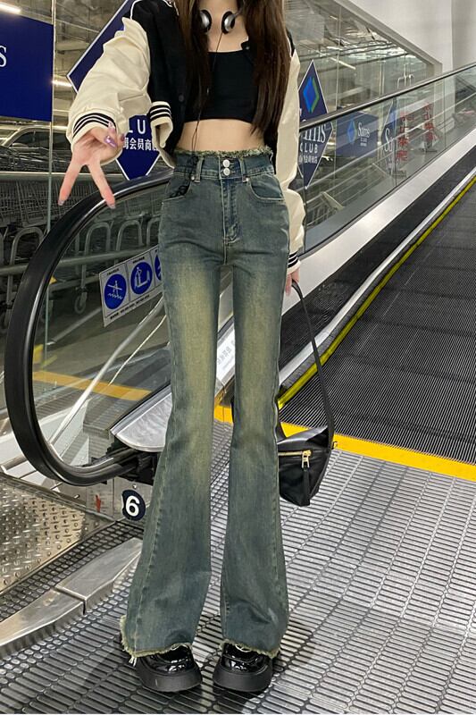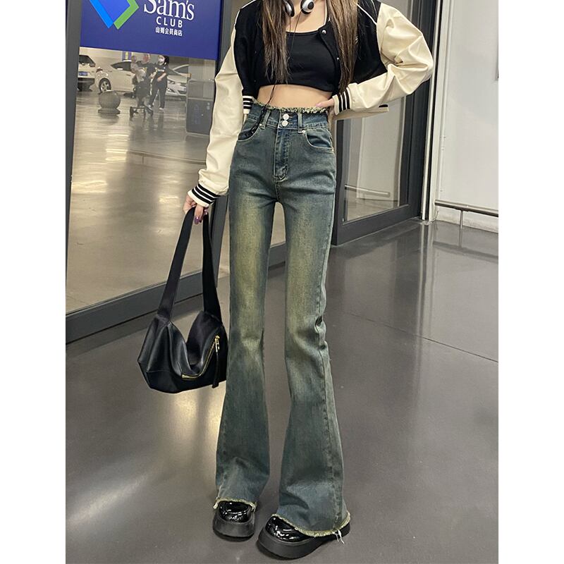 2023 秋の新スタイルファッショナブルなハイウエストローエッジスリムマイクロフレアジーンズパンツ女性のトレンディな レッド オータム 秋物 missk35424528725