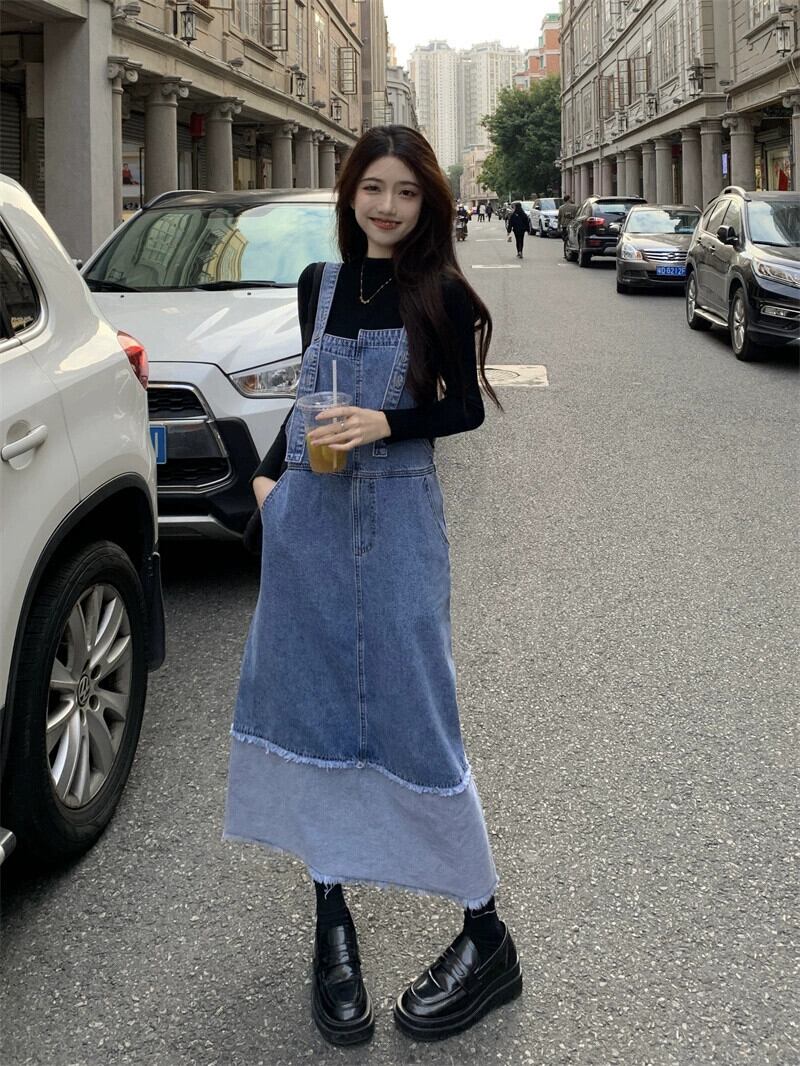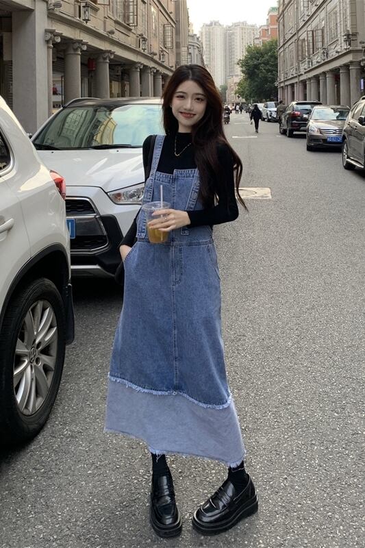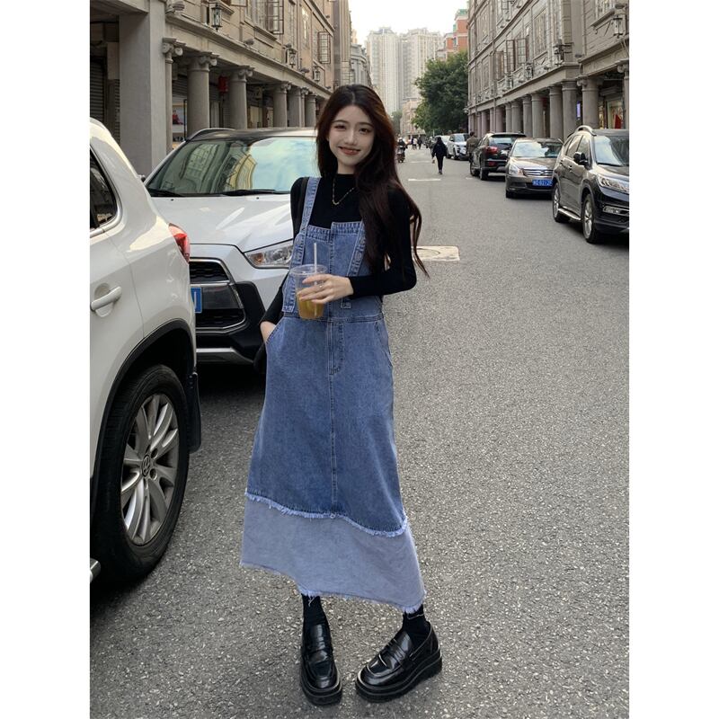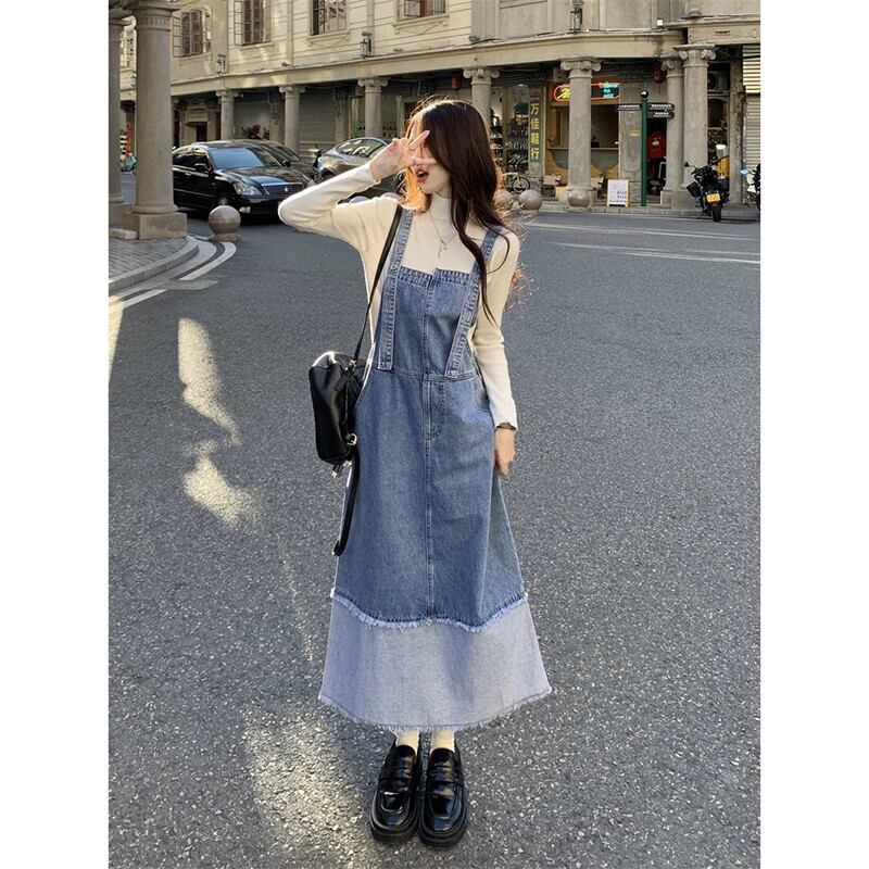 スプライシングデザインミッドレングスデニムサスペンダースカートレディース秋2023新しいレトロハイウエストスリムドレス オータム 秋物 missk77995429446