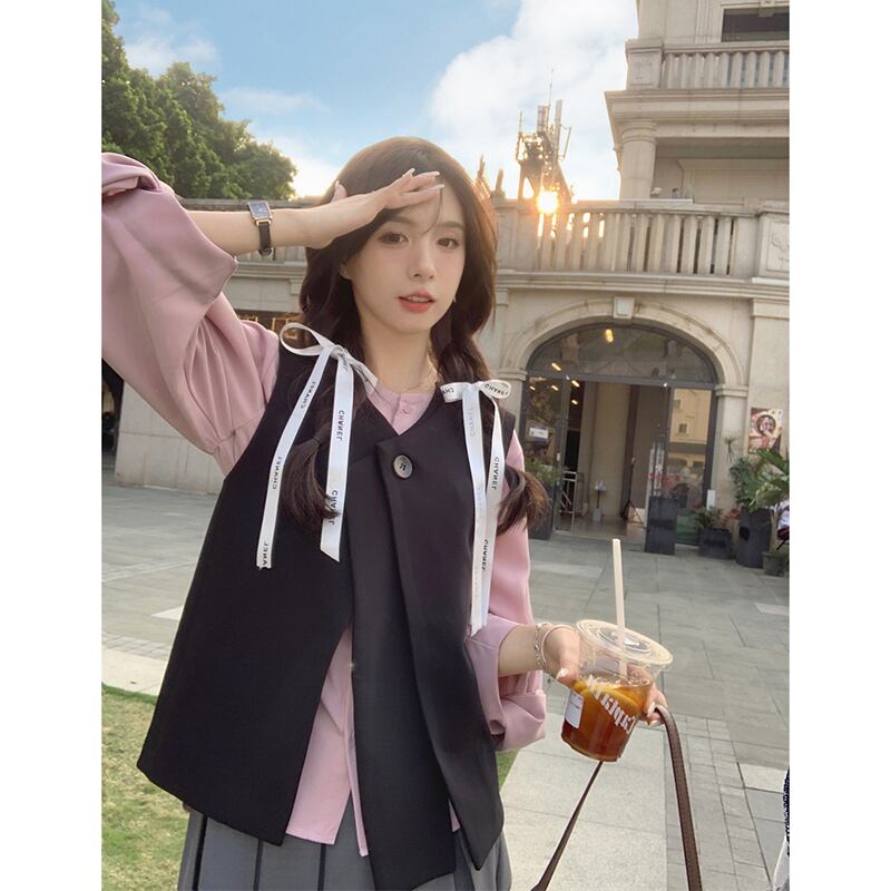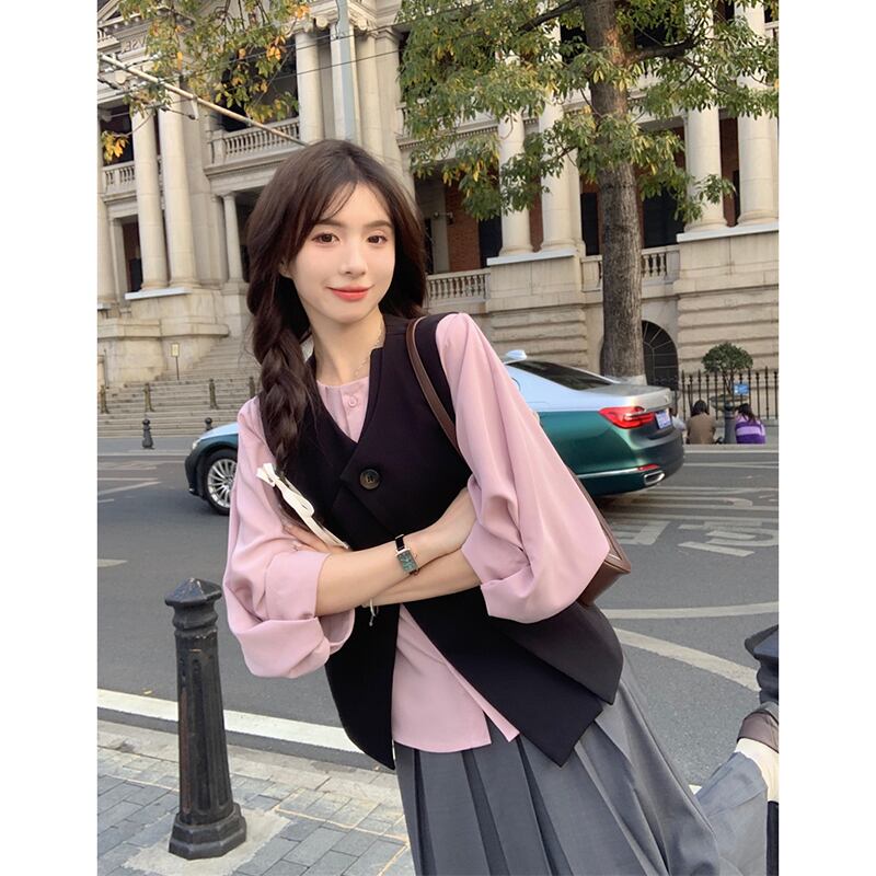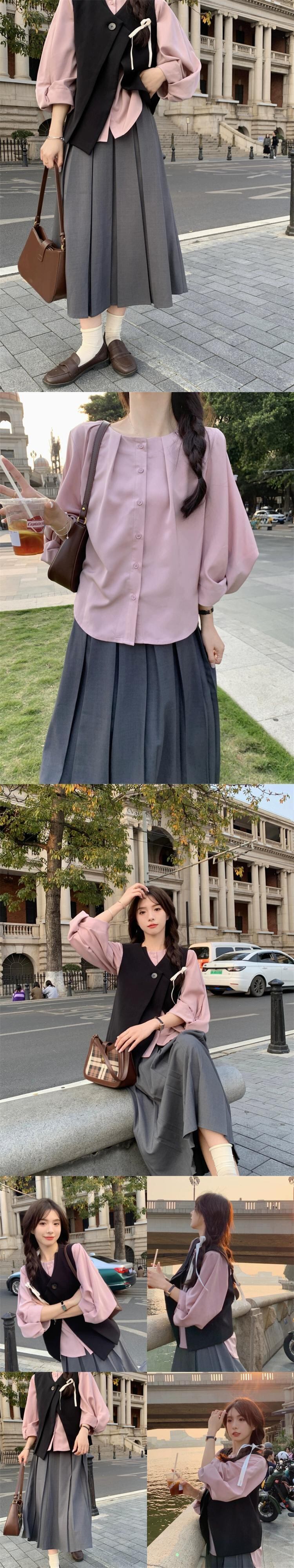 色:ピンクのシャツ,黒のベスト,グレースカート