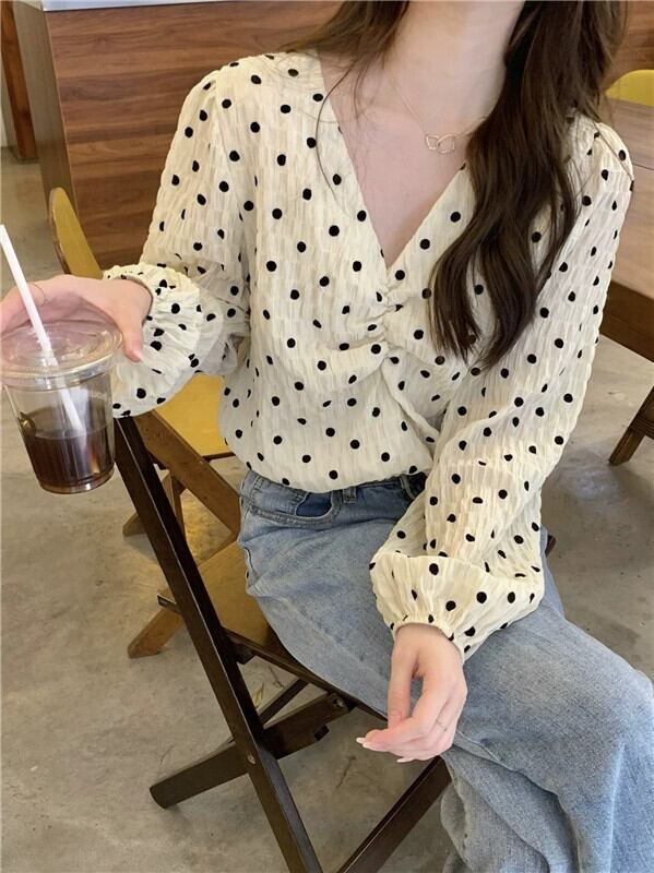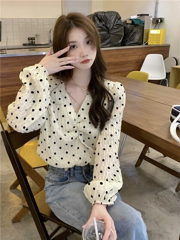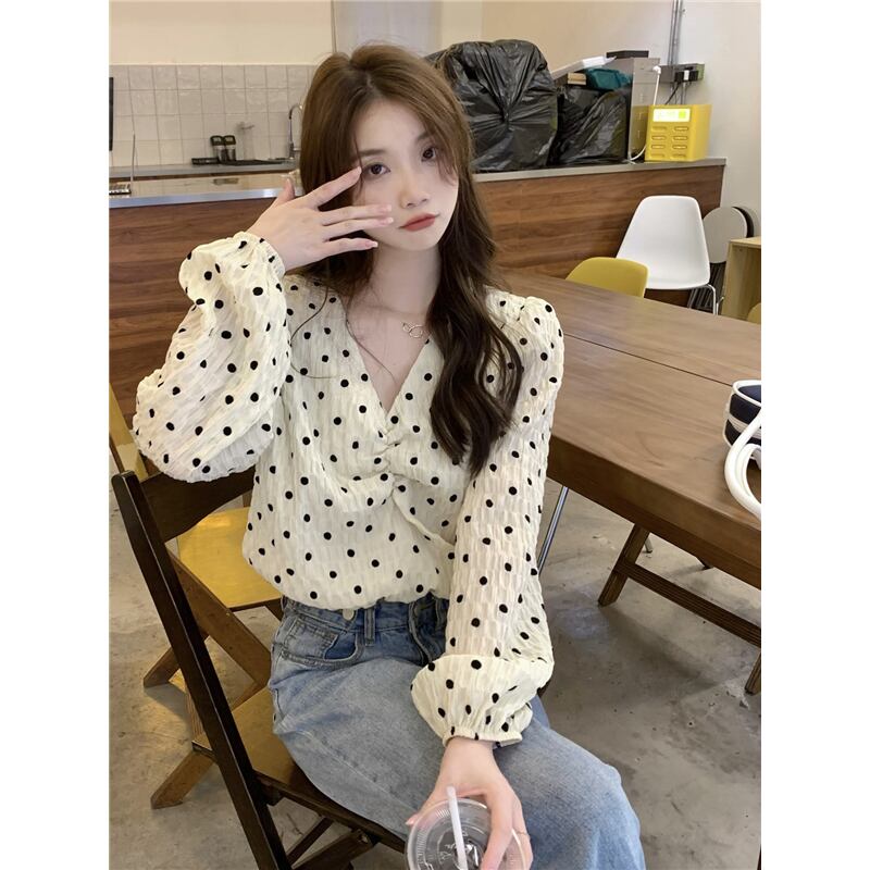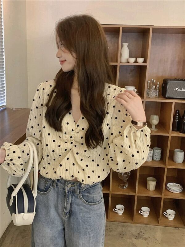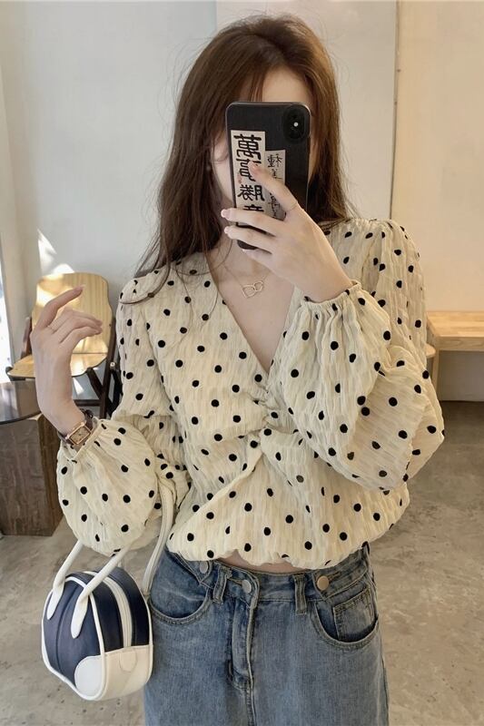 水玉 V ネック パフスリーブ シャツ レディース 2023 秋新作 甘いデザイン ショート プリーツ 長袖 トップ ロング 大人ガーリー スウィート キュート カジュアル オータム 秋物 Vネック missk92170646576
