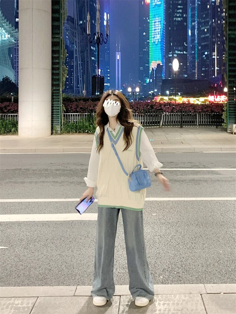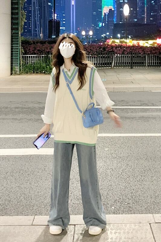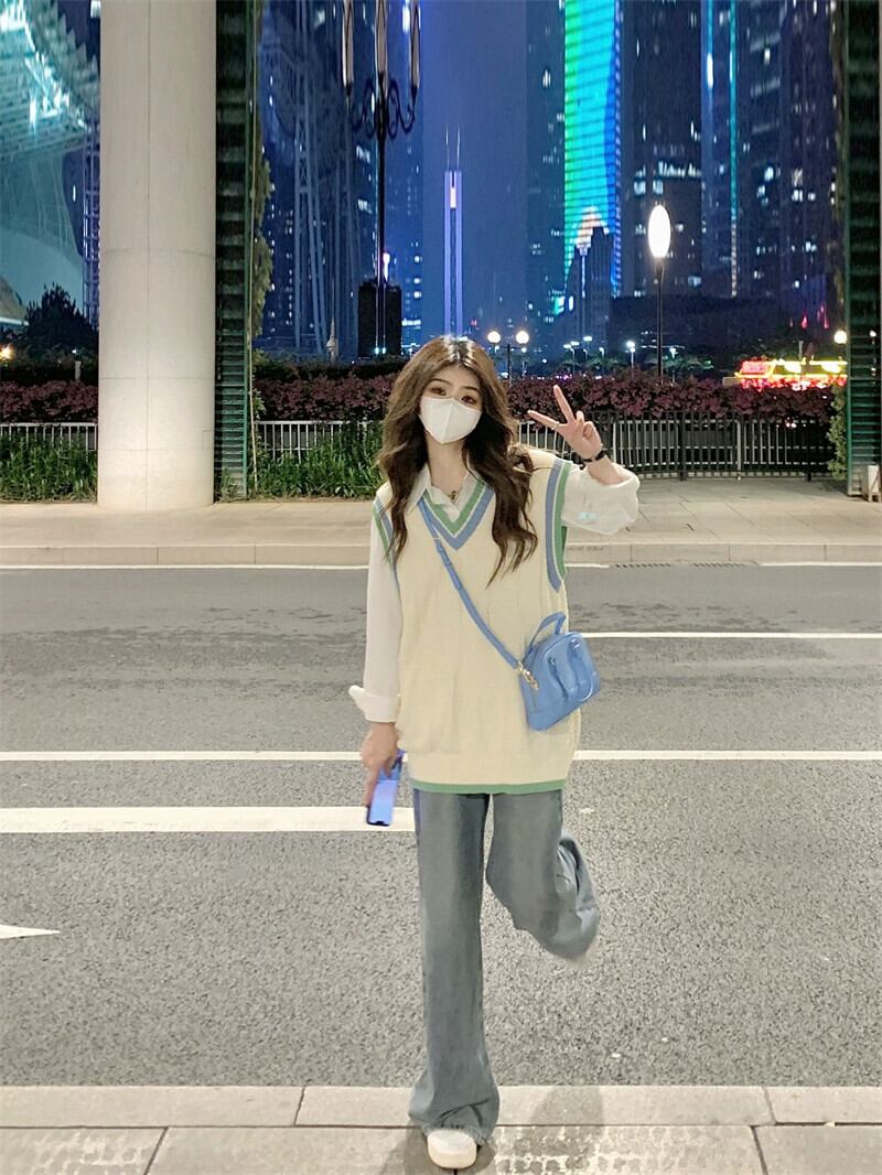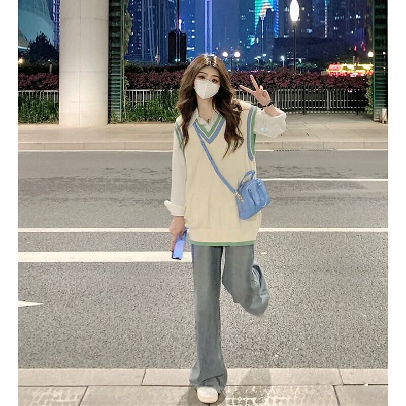 シックなカラーブロック V ネックレイヤードニットベスト秋の新ルーズカレッジスタイルシャツファッションスーツ女性 レッド オータム 秋物 Vネック missk64957149226
