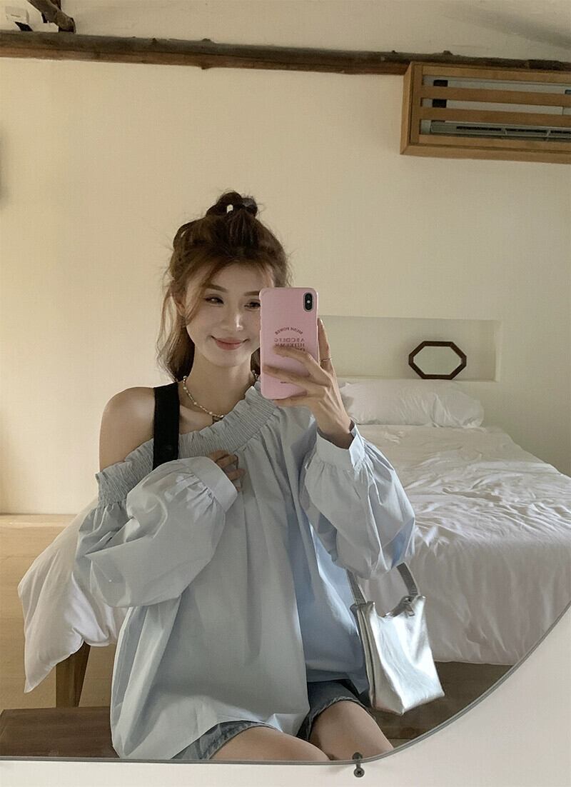 オフショルダー長袖シャツの女性、2023年秋バージョンの新しいスタイル、巧妙なニッチデザイン、プリーツシックなルーズトップ ロング オータム 秋物 missk51141490063