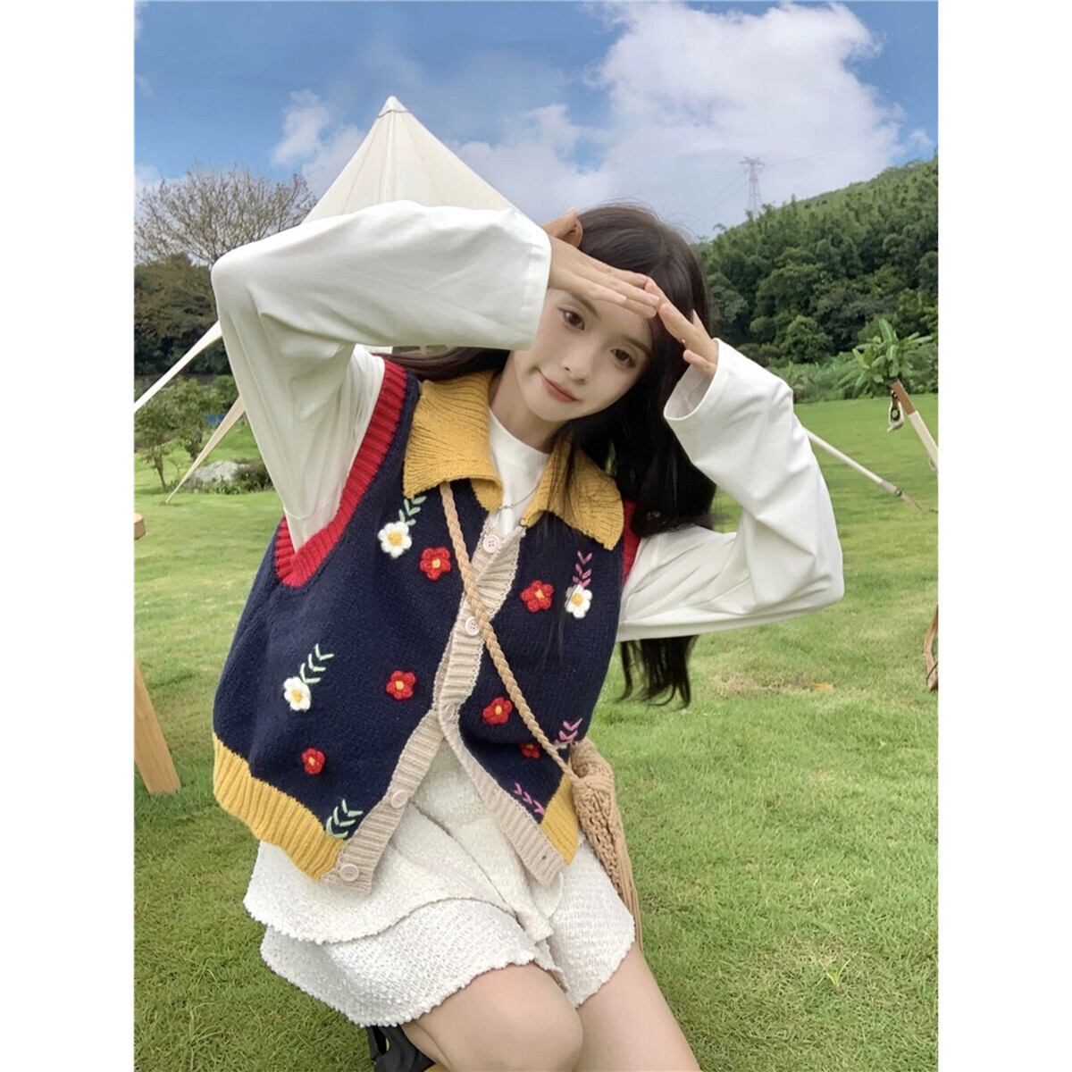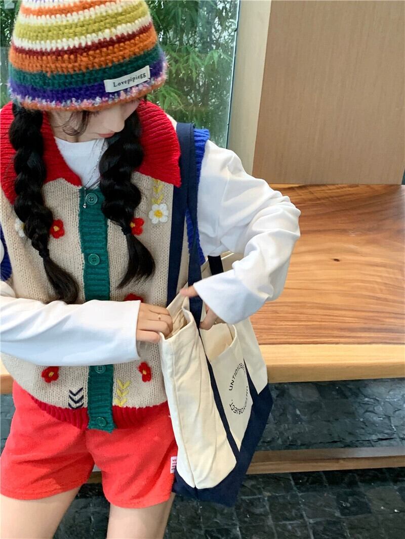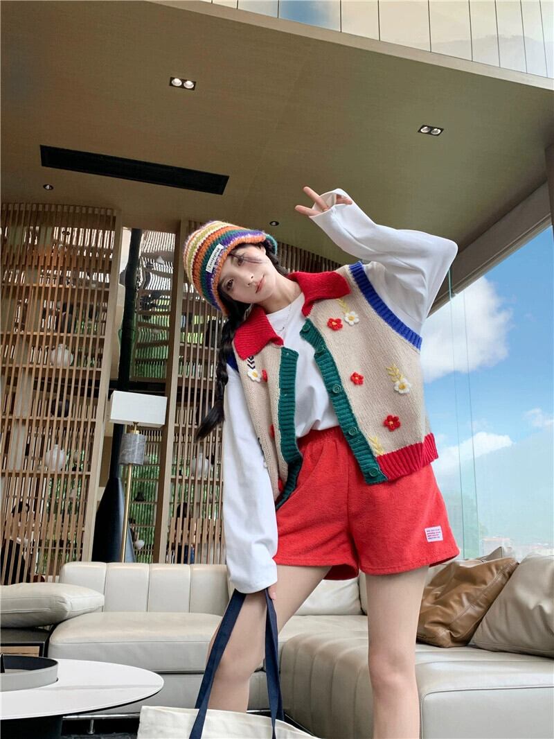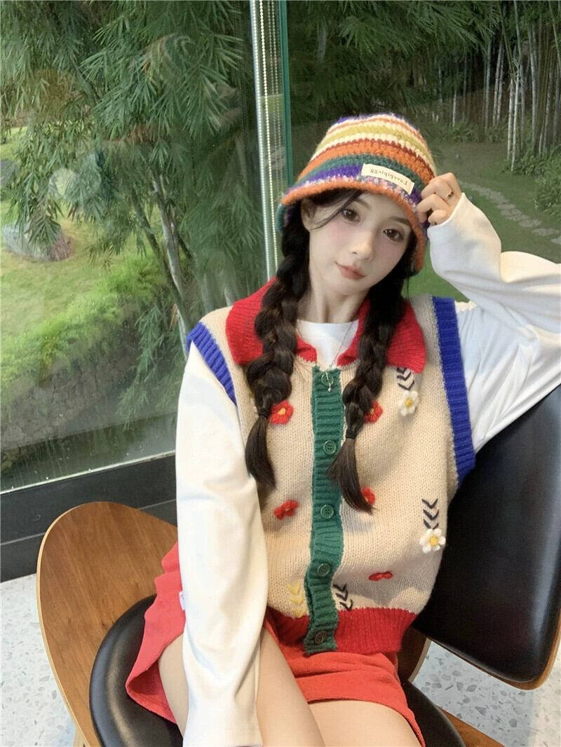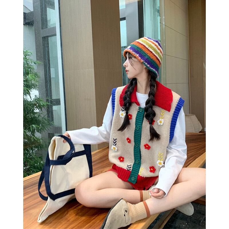 女の子立体フラワーラペルベスト秋の新作ゆったりとしたファッショナブルなデザインのノースリーブニットベストトップ オータム 秋物 フラワーデザイン missk19234973733