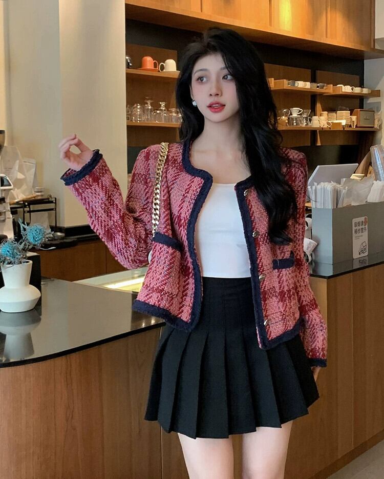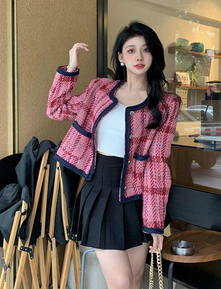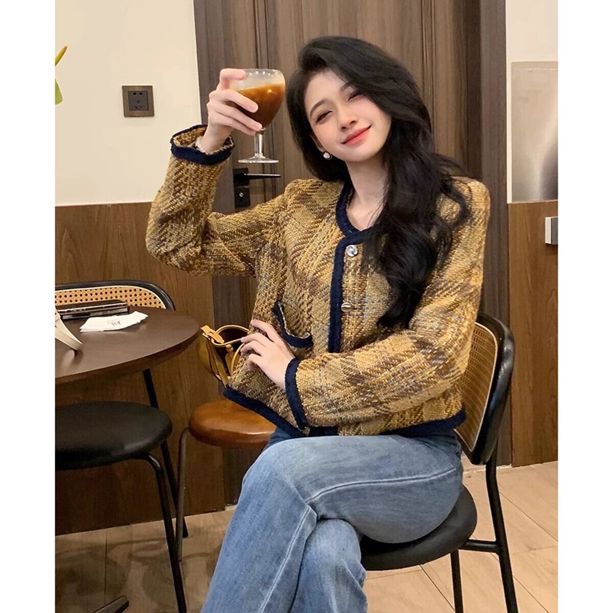 2023 秋の新スタイルフランスの気質多用途ラウンドネックコントラストチェック柄ショートコートハイエンドルーズトップ女性 オータム 秋物 Oネック missk86732891286