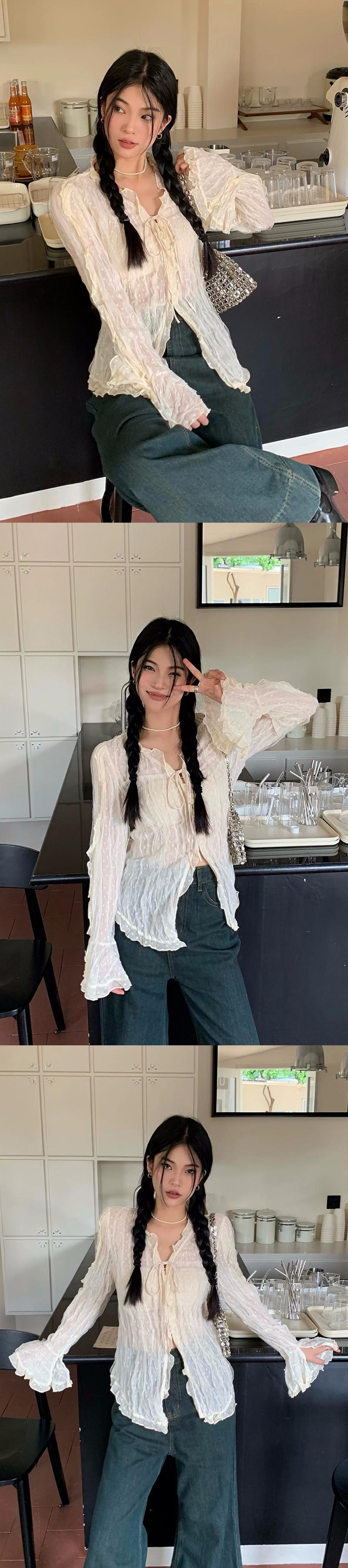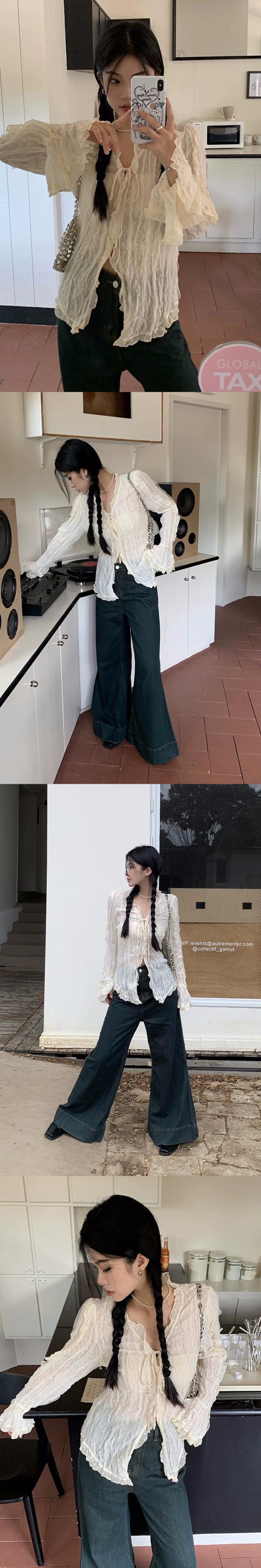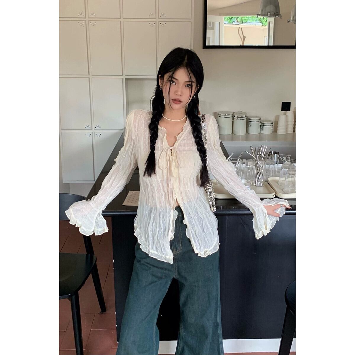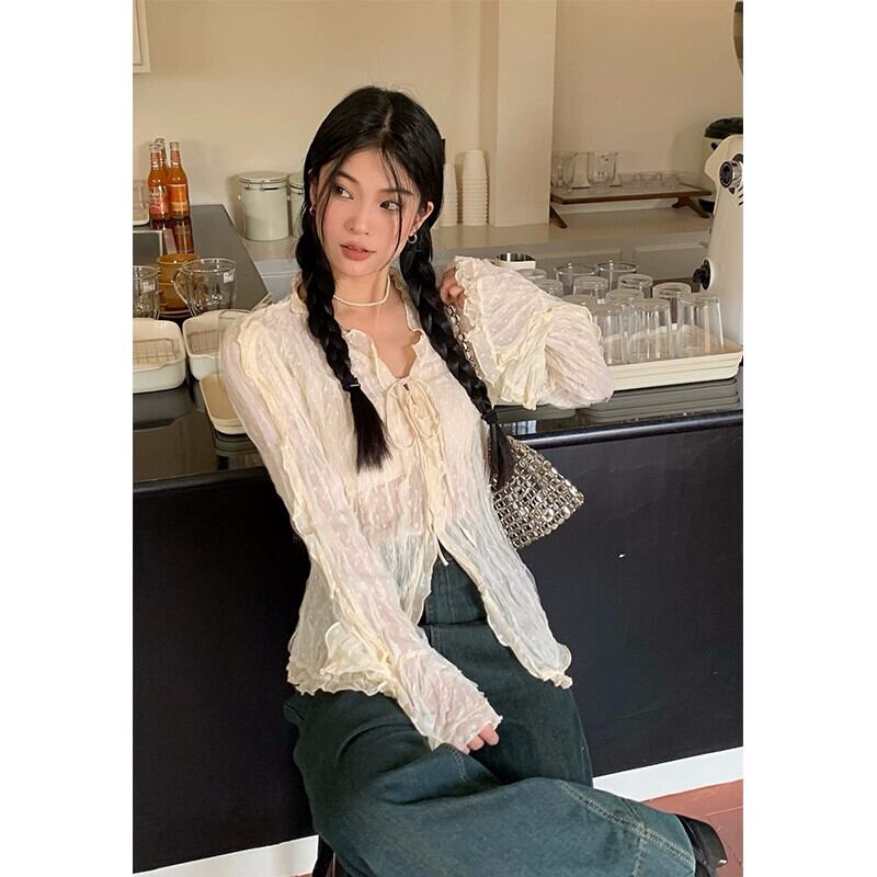 2023 秋の新長袖フレンチデザインのハイエンド気質ニッチ痩身レースアップ V ネックレースシャツ女性 ロング オータム 秋物 Vネック missk38147987472