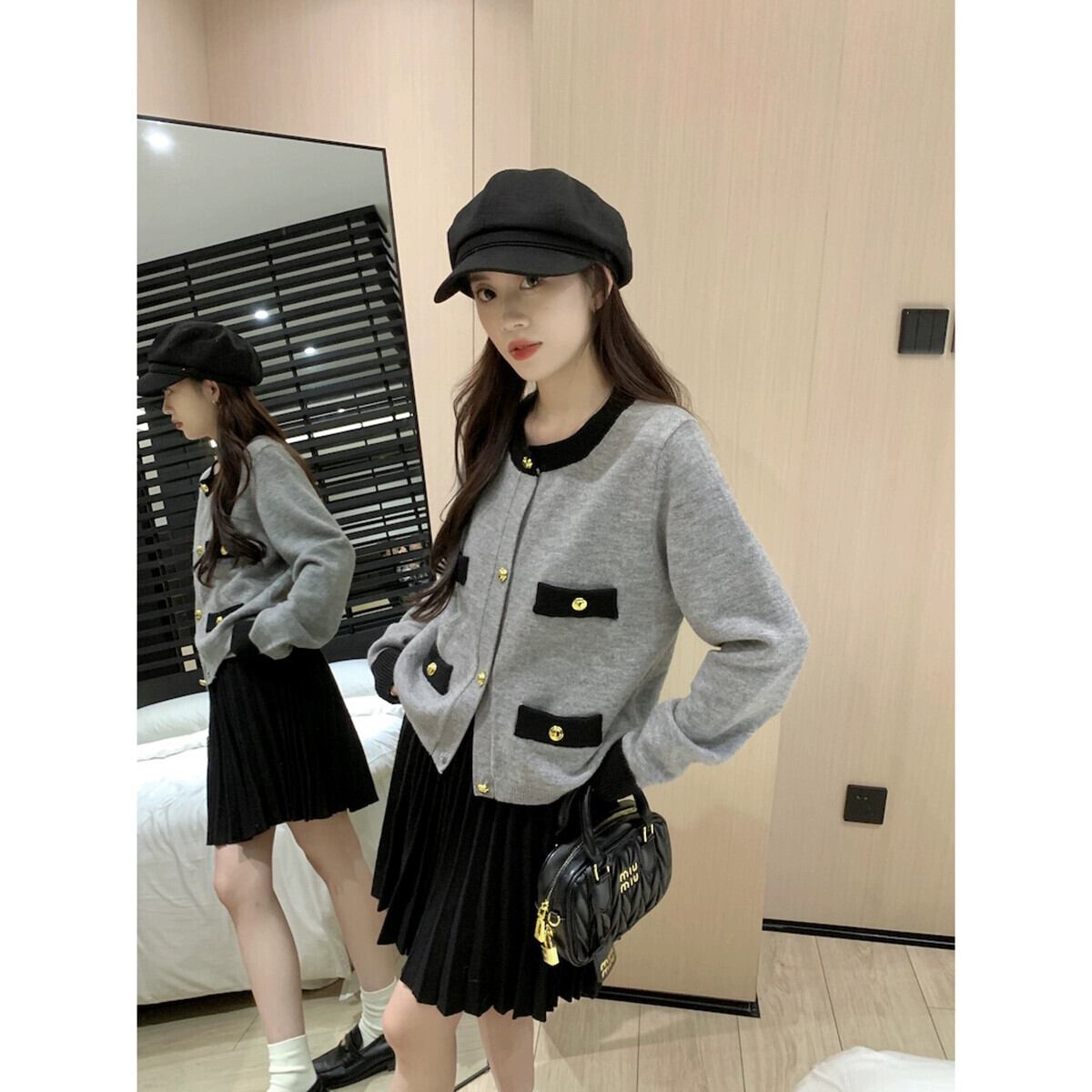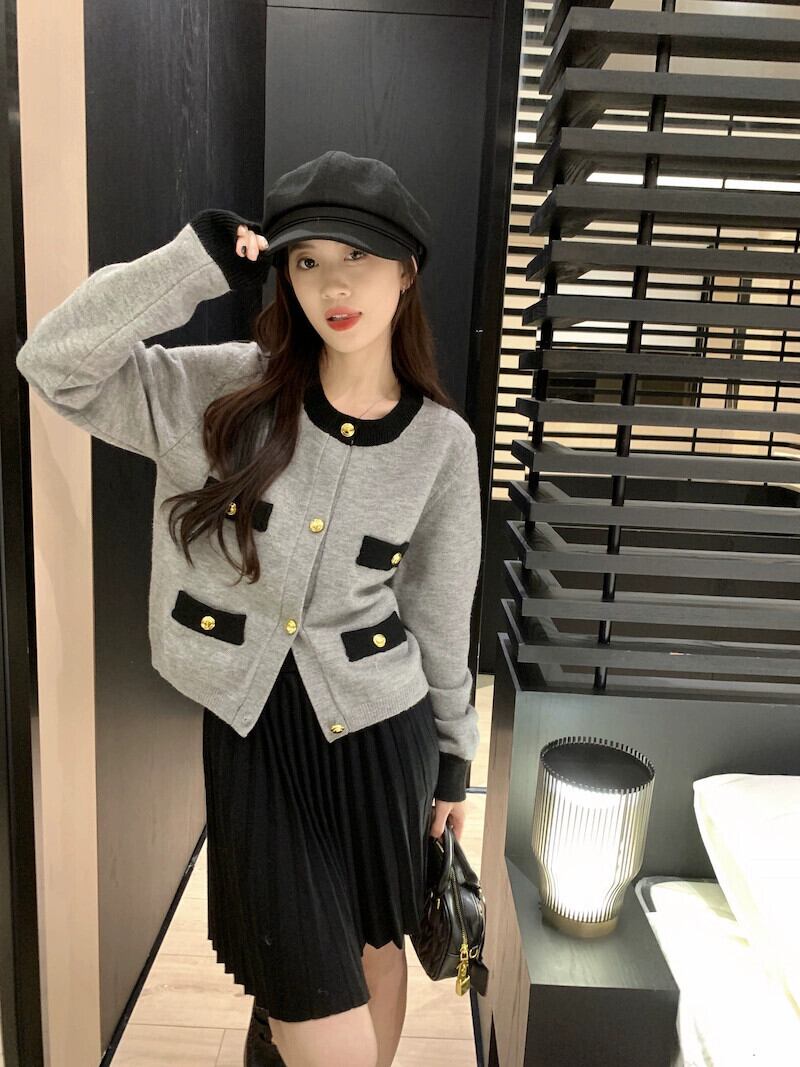 Xiaoxiangfeng ニットカーディガン女性の秋 2023 新しいハイエンドコントラストカラーラウンドネックシングルブレスト長袖セータージャケット ロング オータム 秋物 Oネック missk3242764602