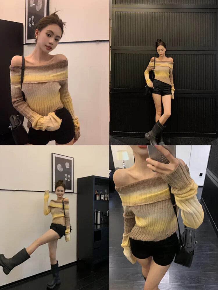 秋レトロ 2023 ホットガールスリムホールワンショルダーグラデーションタイダイ長袖セーター女性 ロング オータム 秋物 missk2675230934