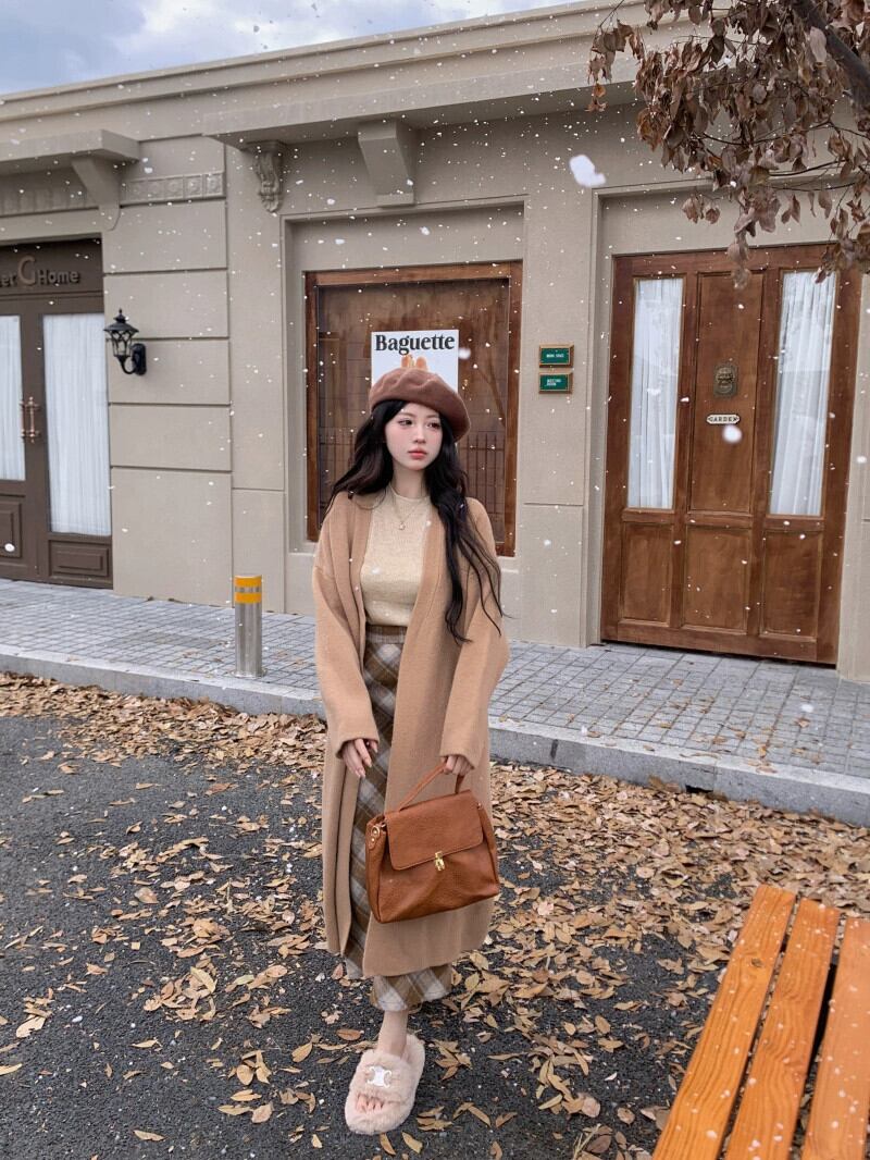 色:ミルクティーカラーコート,アプリコット半袖シャツ,ウールチェックスカート