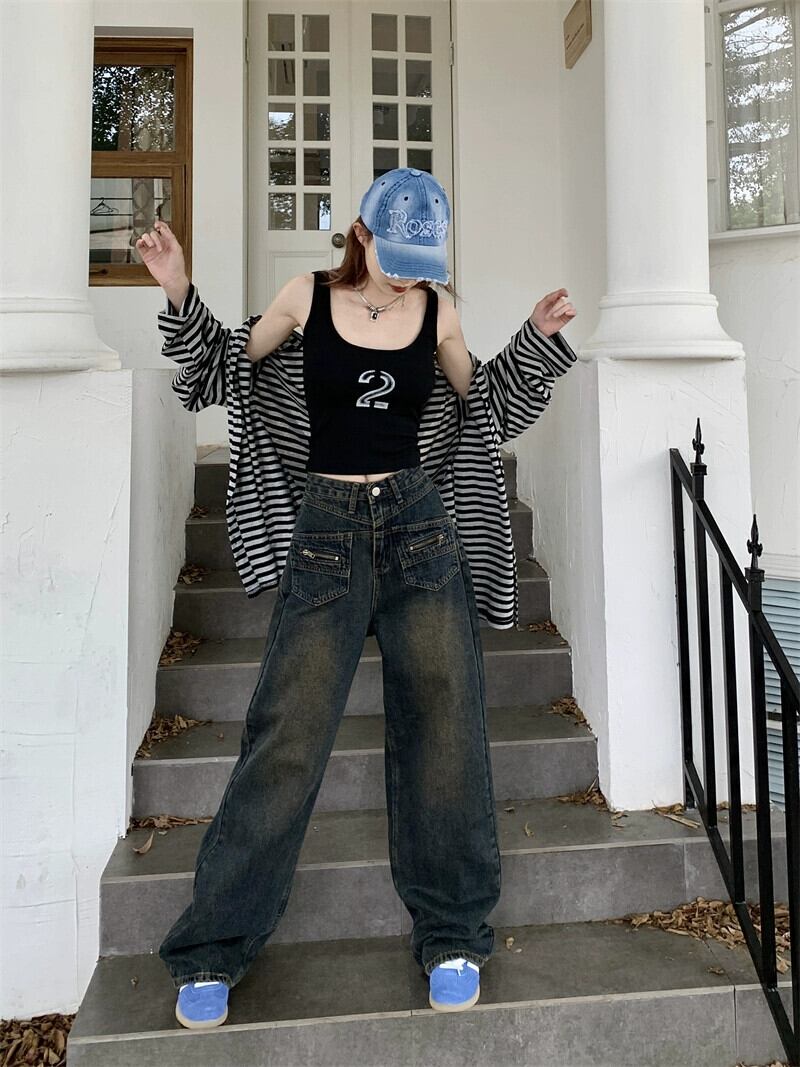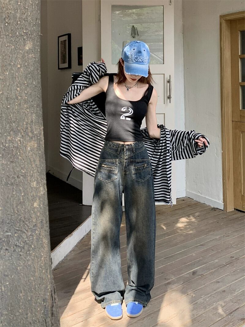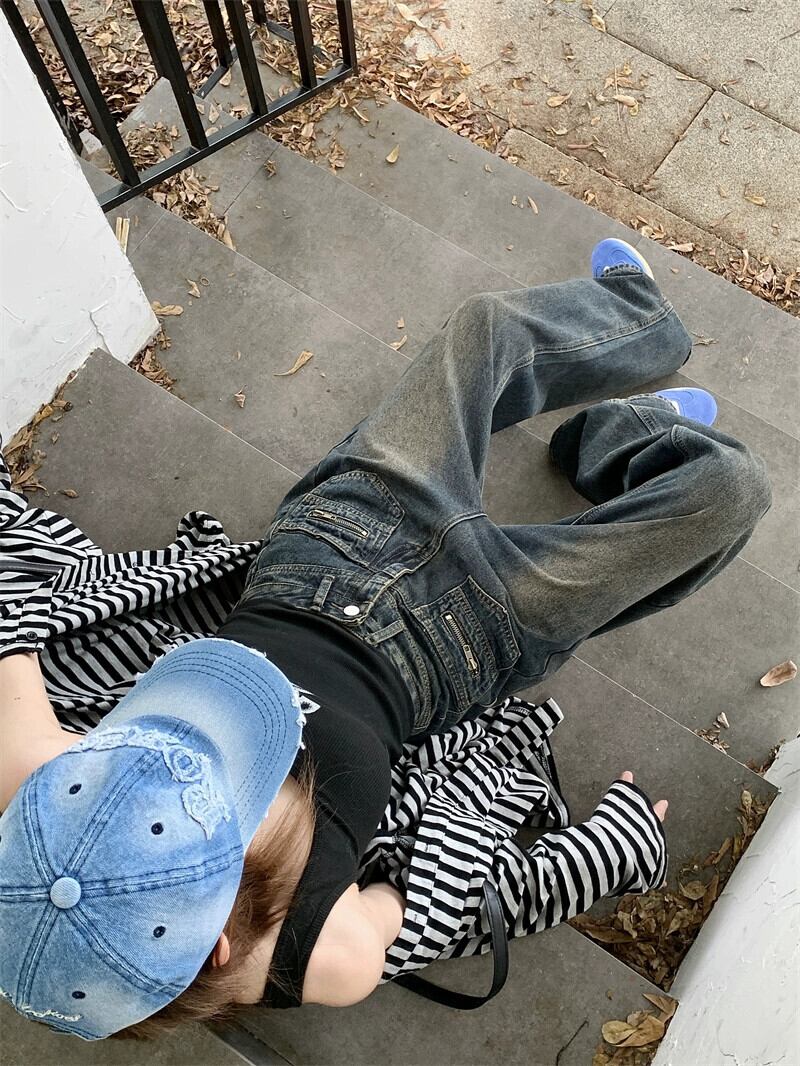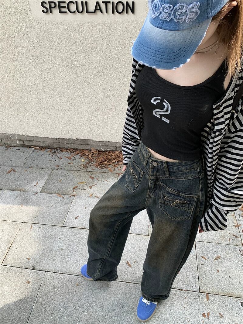 レトロデニムワイドレッグパンツ女性秋 2023 新しいハイストリートスタイルデザインハイウエストスリムストレートフロアモップパンツトレンディな ハイウェスト オータム 秋物 ワイドパンツ missk98934502271