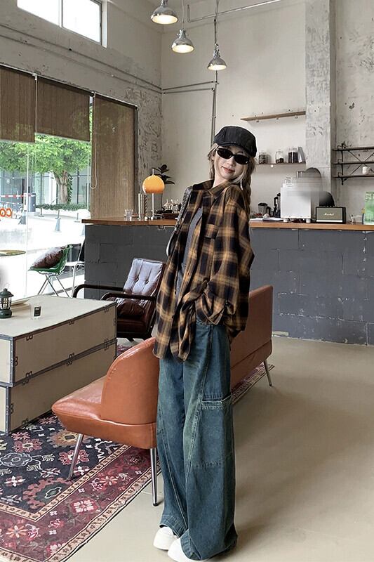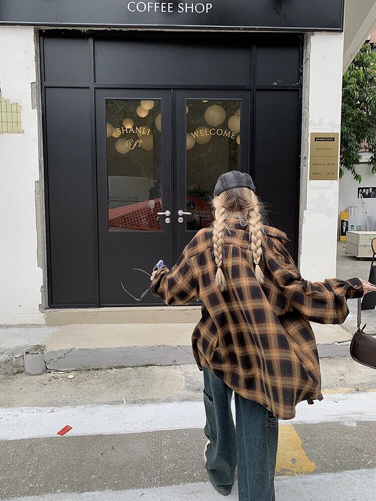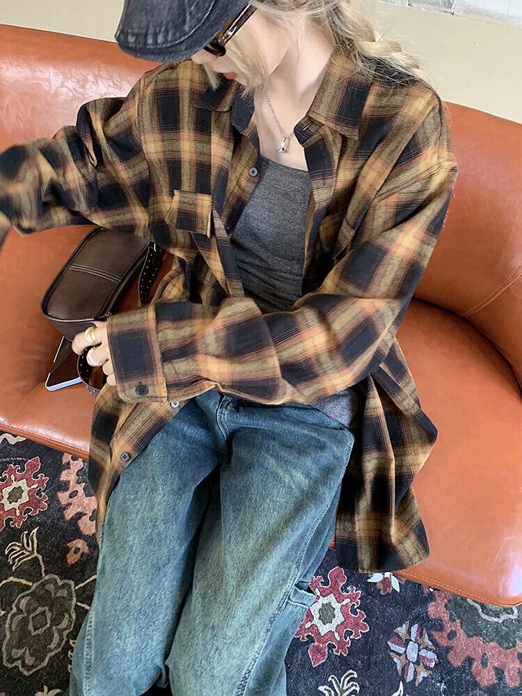 アメリカンレトロ起毛チェック柄シャツレディース2023年秋新作ゆったりミドル丈デザイン長袖カーディガン ロング オータム 秋物 missk64269682300