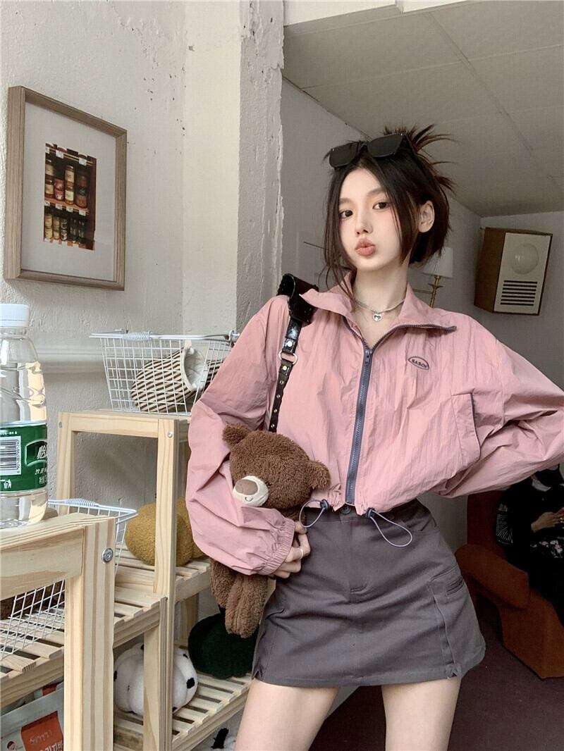レトロ巾着ショート長袖日焼け防止ジャケット女性 2023 秋の新デザインスタンドアップカラージッパートレンディなジャケット ロング オータム 秋物 missk4091663360