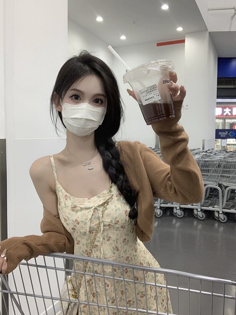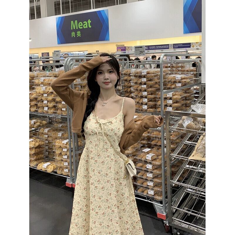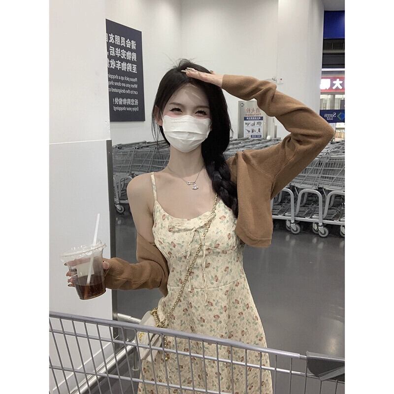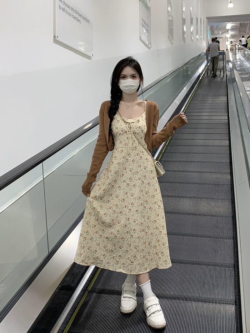 色:キャラメルカーディガン,アプリコットボトムの花柄サスペンダースカート