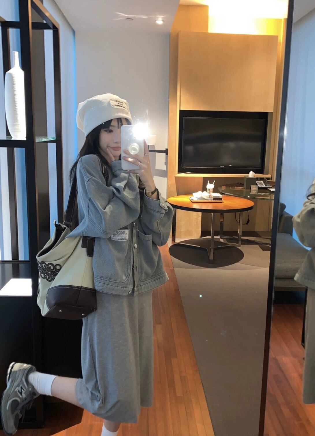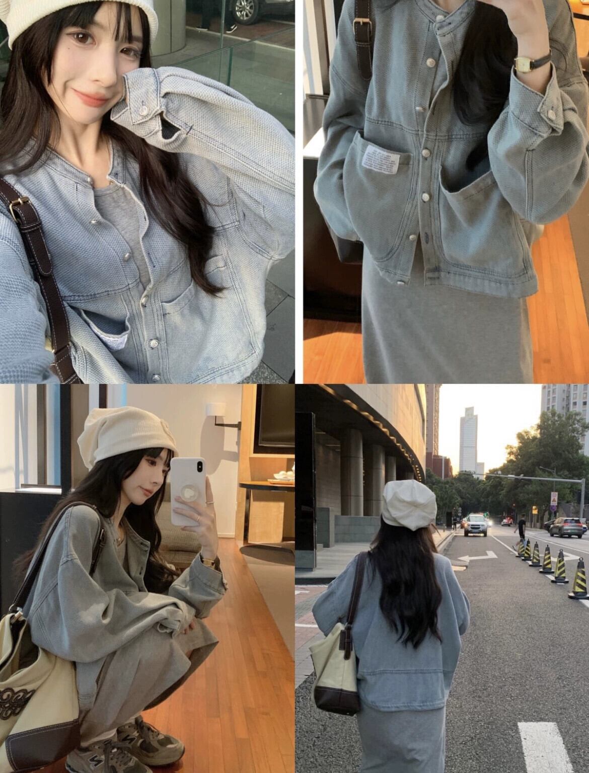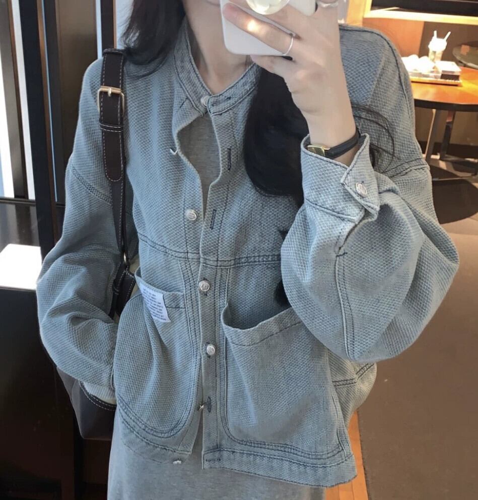 レトロウォッシュデニムジャケットレディース2023年秋新デザインラウンドネックルーズソルトスタイル万能長袖トップ ロング オータム 秋物 Oネック missk85540745649